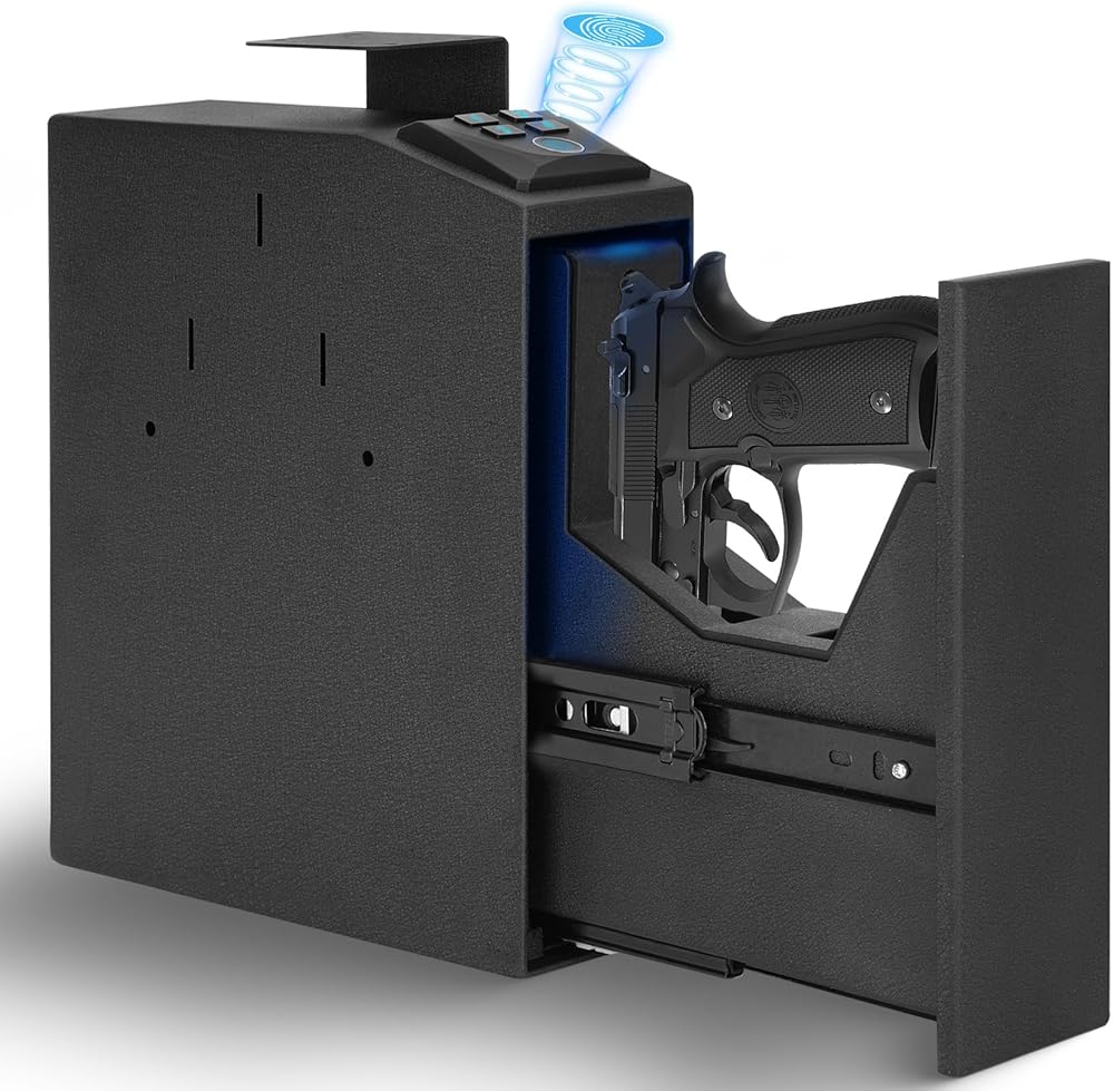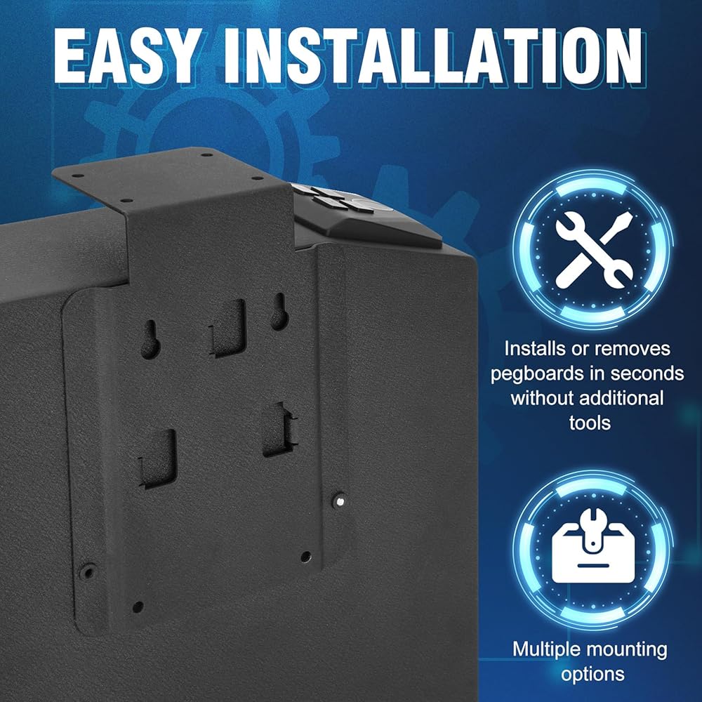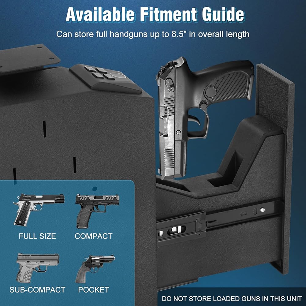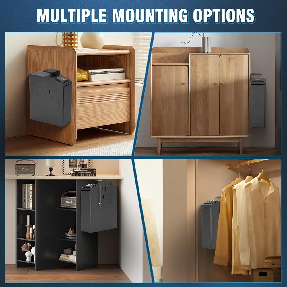 EASY TO INSTALL AND HIDE:External dimensions of gun safe: 11.8" H * 10.2" D * 3.5" W X. Weight: 12.1lbs. With the included screws, the gun safe can be easily installed on any surface or side, such as desk, nightstand, bookshelf, etc., and can be placed directly on the floor or in the car for use. Compact small black gun safe is very suitable for hiding
