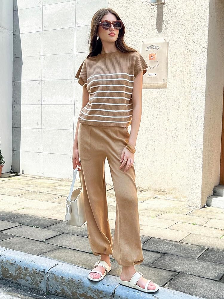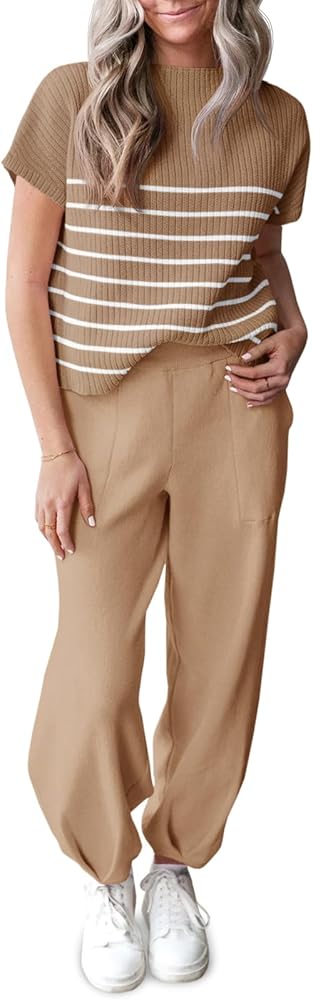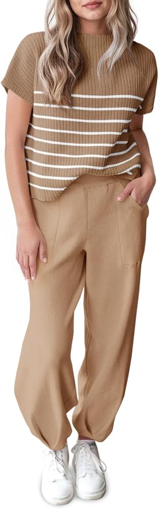 Fashionable Style: This stylish two-piece outfit showcases your fashion statement, featuring a crew neck, cap shoulder, short sleeve sweater knit pullover top and elastic high waist tapered sweatpants with side pockets, creating a trendy and active silhouette