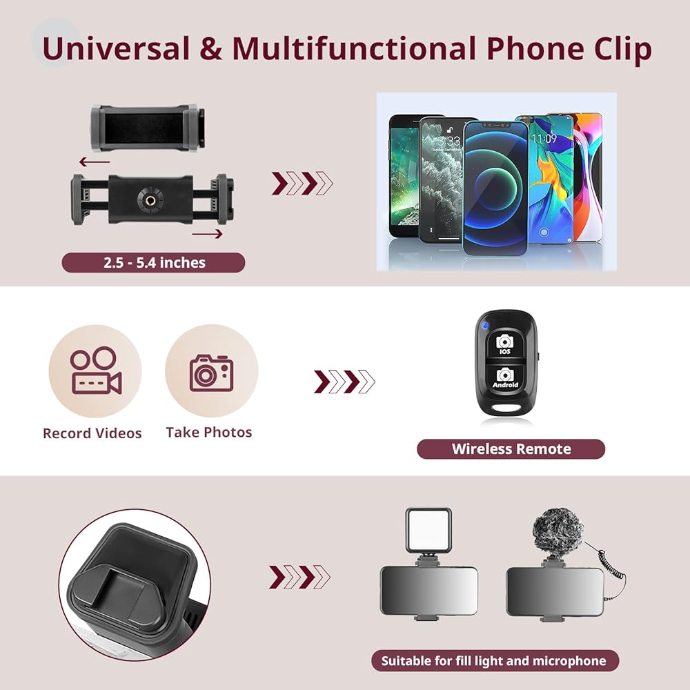 Versatile Phone Clamp and Remote: The phone clip fits iPhones and Androids (2.5 to 5.7 inches) with cases and includes a cold shoe mount for lights or a microphone. The remote works with iOS and Android, no app needed