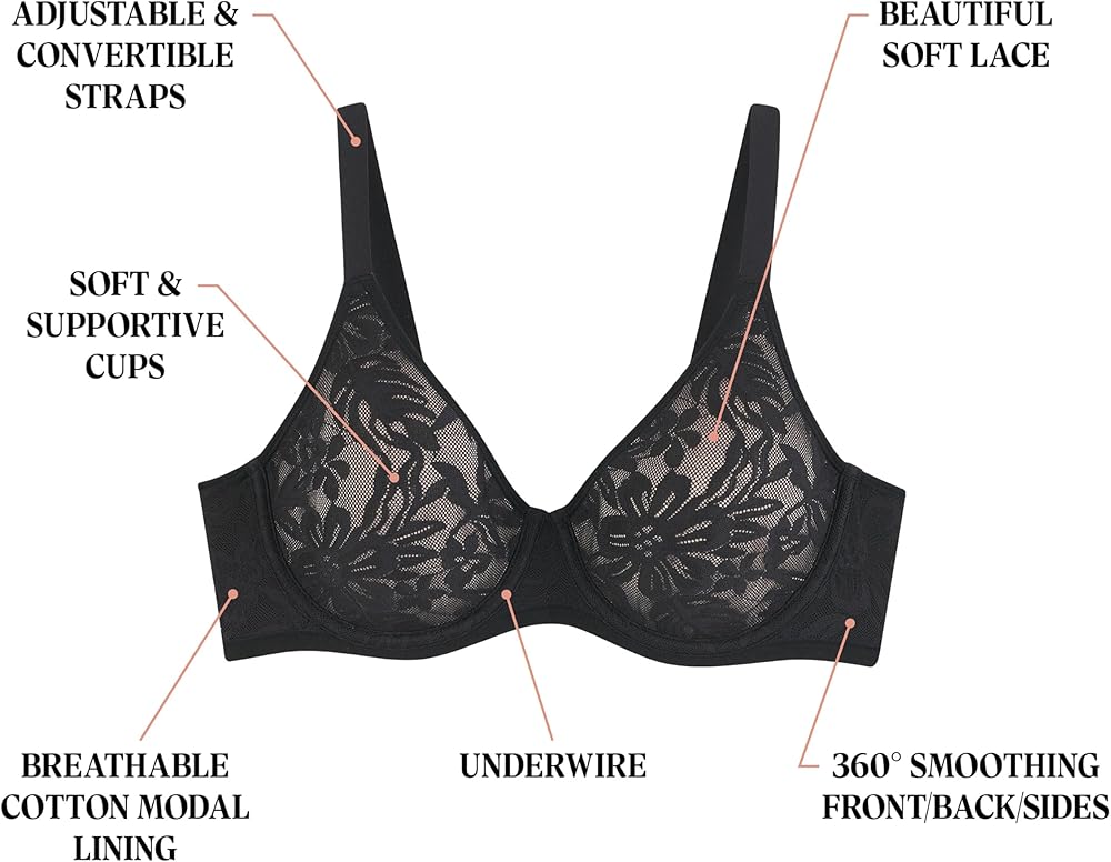BREATHABLE COMFORT - The bottom band, back, and sides are lined with a breathable cotton modal liner that helps keep you cool and dry. A comfortable underwire offers the support you want in a full-coverage bra.