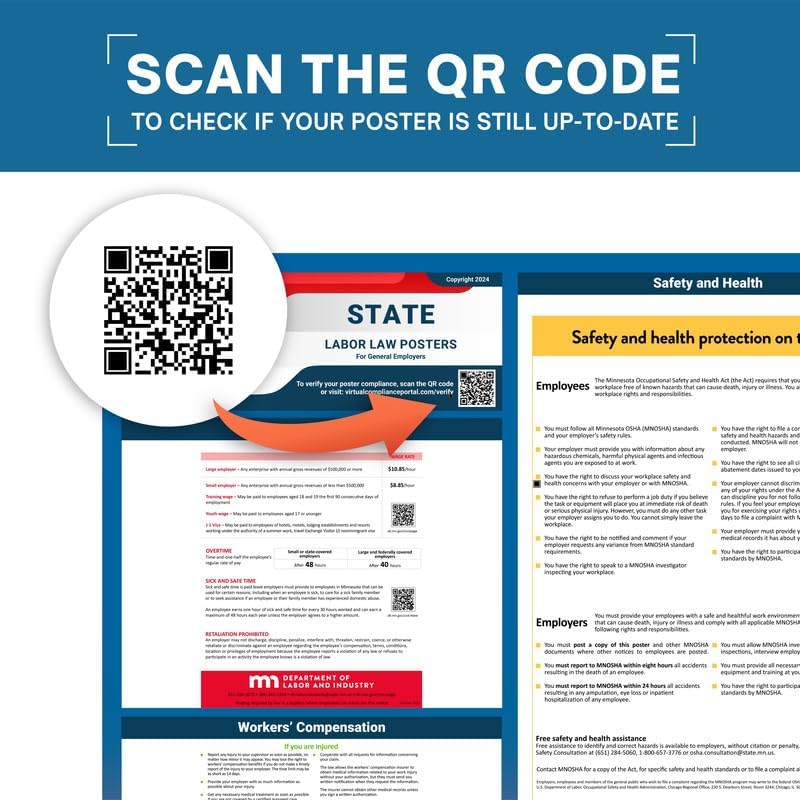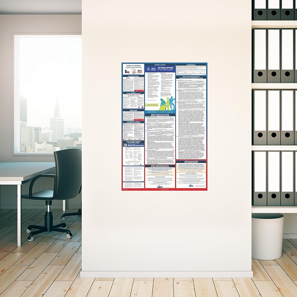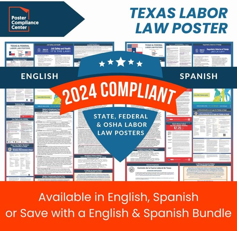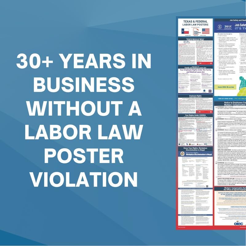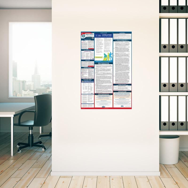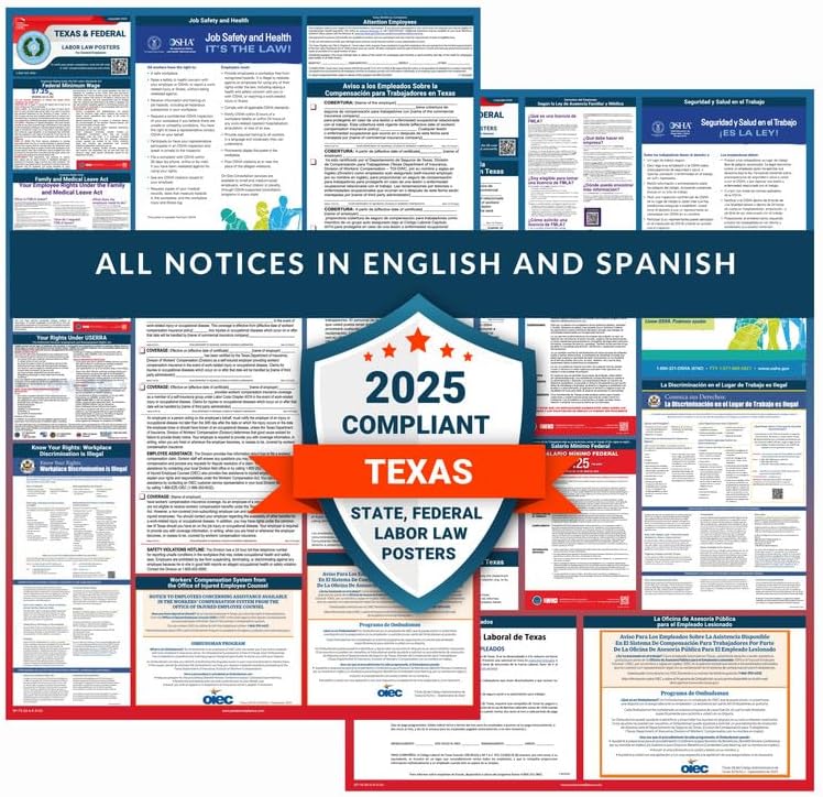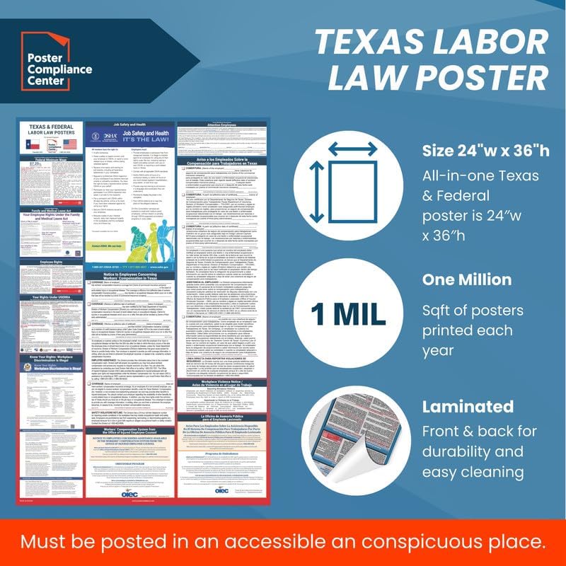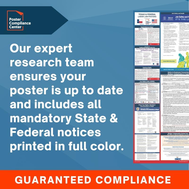GUARANTEED COMPLIANCE & ACCURACY: Most up to date 2024 Texas State and Federal Labor Law Poster with all notices in one simplified design. Display notices such as minimum wage, OSHA, USERRA, Workers' Compensation, FMLA, Workplace Discrimination is Illegal, and more. Our compliance notices are regularly audited - in over 30 years of business, we have never incurred a labor law violation!