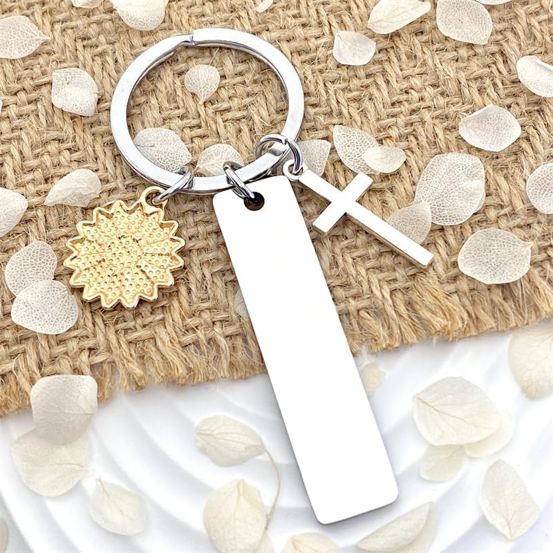 【Specifications】The keychain is rectangular, size: 3.14 x 0.39 inches. The diameter of the key ring is 1.18 inches. The thickness is: 0.05 inches. It also comes with sunflower and cross style accessories