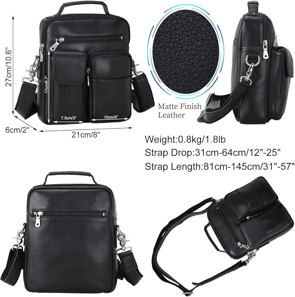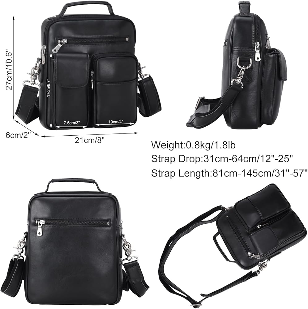 【Dimension and Structure】Size: 9"(L) x 3"(W)x 11"(H), Weight: 1.3 lb/0.6 kg. Strap Length:27.5”-52.7”. Strap Drop: 11.8”-25”. Structure: 1 main compartment ( contains 1 inner zipper pocket, 1 phone pouch, 1 wallet pouch), 1 small front pouch, 1 back zipper pocket. It can keep 10” tablet, cards, wallet,telephone, umbralle,water bottle, passport organized. And it is utility to be carried as shoulder bag, crossbody bag, messenger bag.