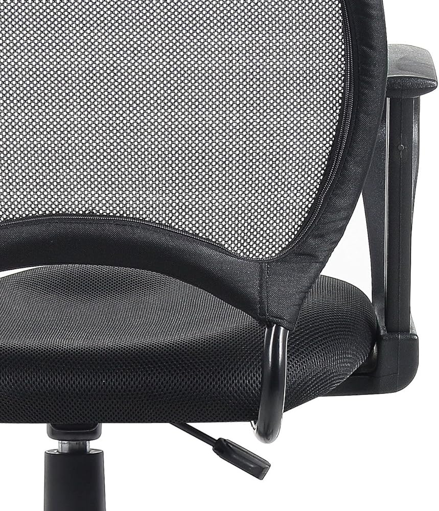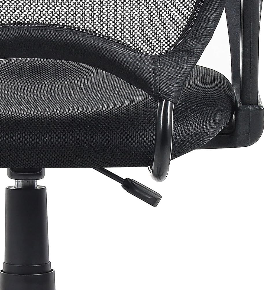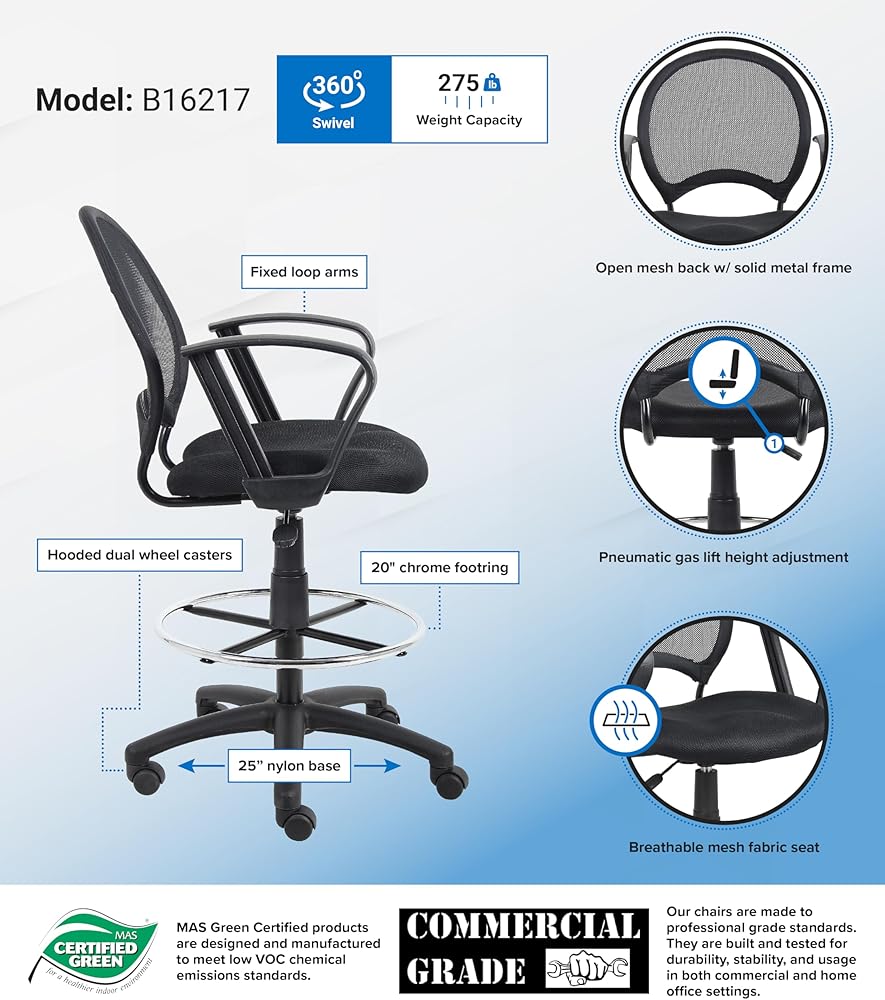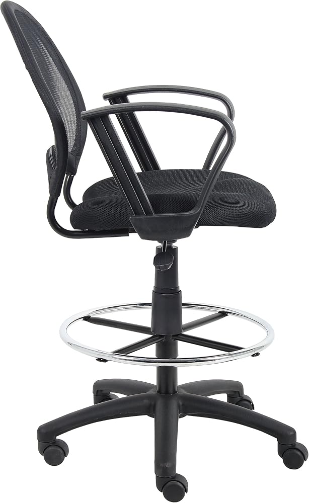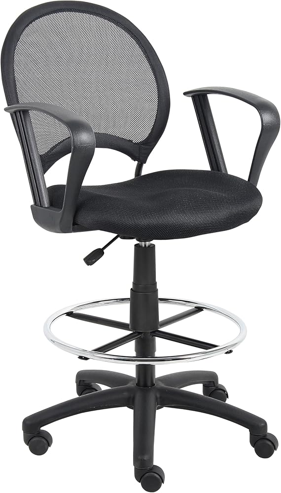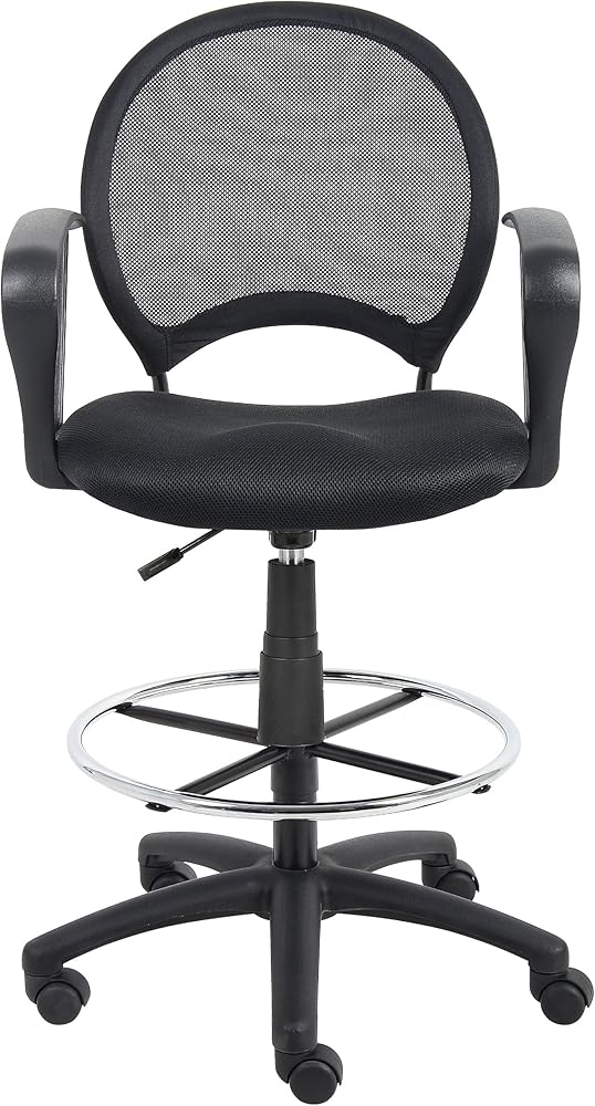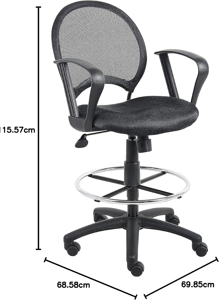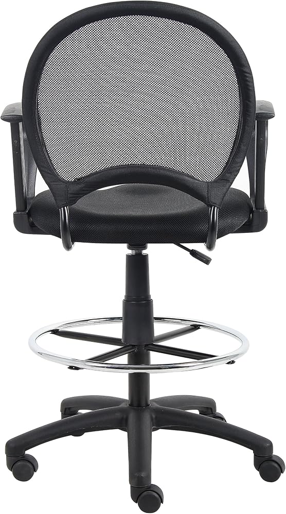 Open mesh back with solid metal back frame with ballistic nylon wrap. Breathable mesh fabric seat with ample padding. 25" nylon base. Hooded double wheel casters. Pneumatic gas lift seat height adjustment. 20" diameter chrome Footring. Height adjustable arms.