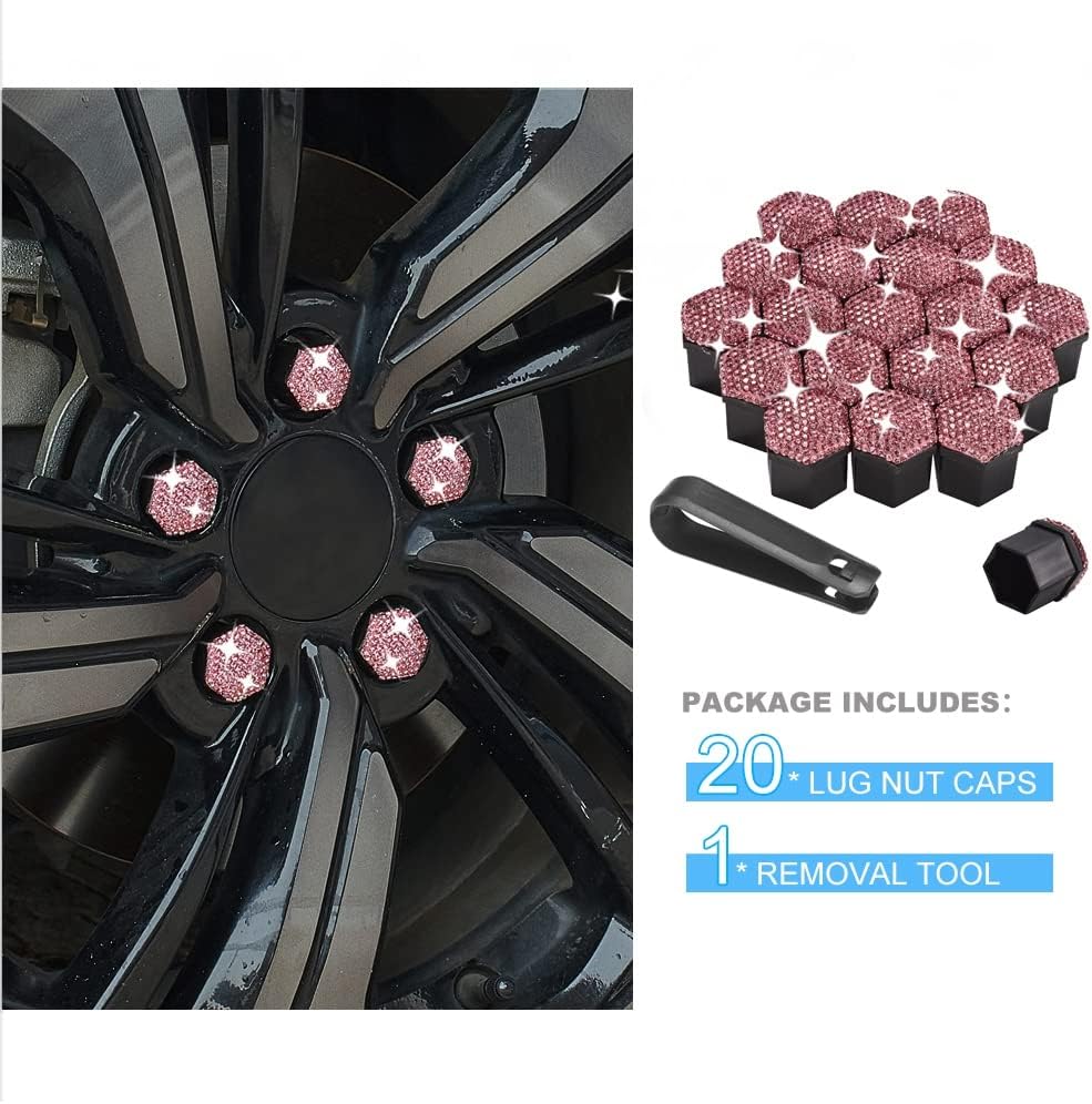 The package includes 20pcs wheel nut bolt cover caps and a removal tool