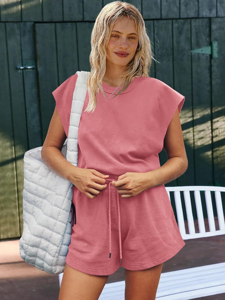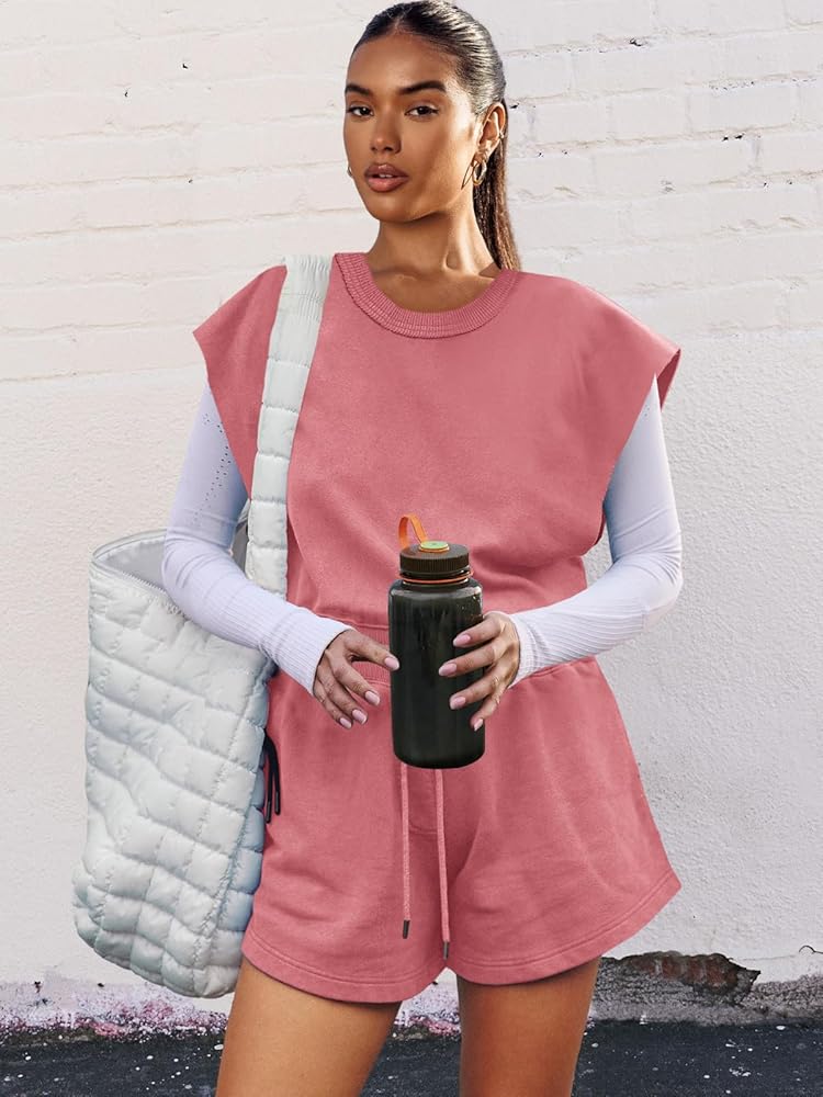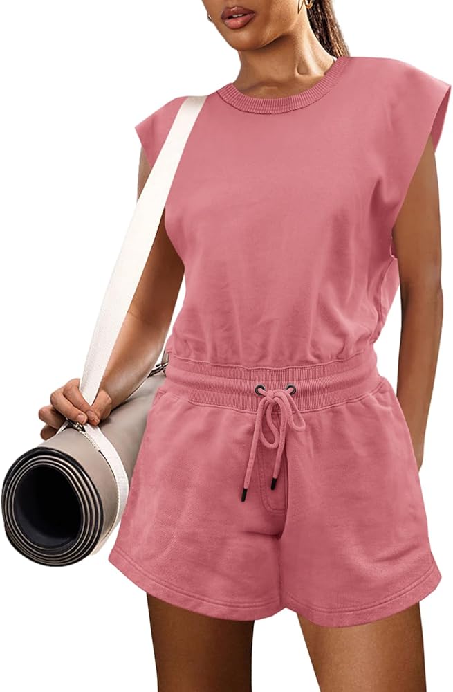 SHORT ROMPERS-Jumpsuits for women casual fitness attire featuring side seam pockets and adjustable drawstring waist. Workout jumpsuits for women featuring a keyhole open back feature for ease of wear and a drawstring waist cinch for simple adjustment