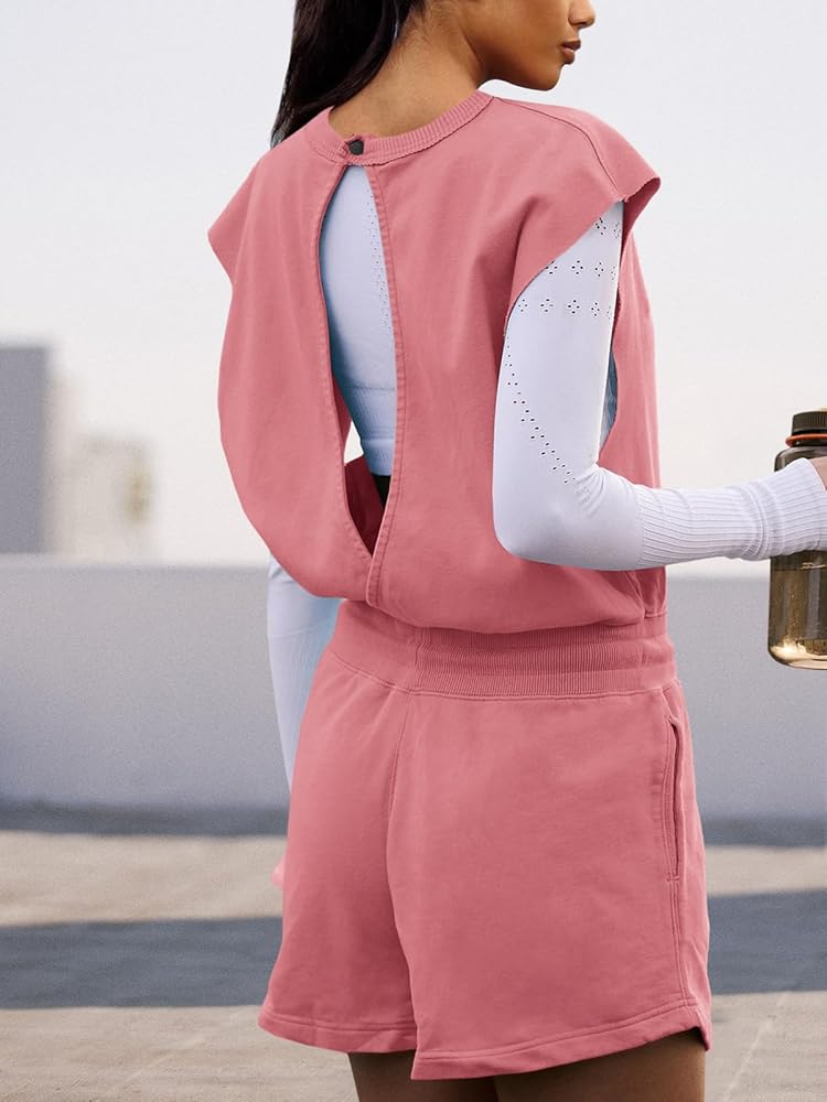 OPEN BACK JUMPSUIT-Short one piece jumpsuits for women loose fit are made of breathable, lightweight cloth with a crew neck, muscle tee upper, and a short, loose-fitting bottom. Such a athletic romper with pockets is comfortable to wear on a lazy day