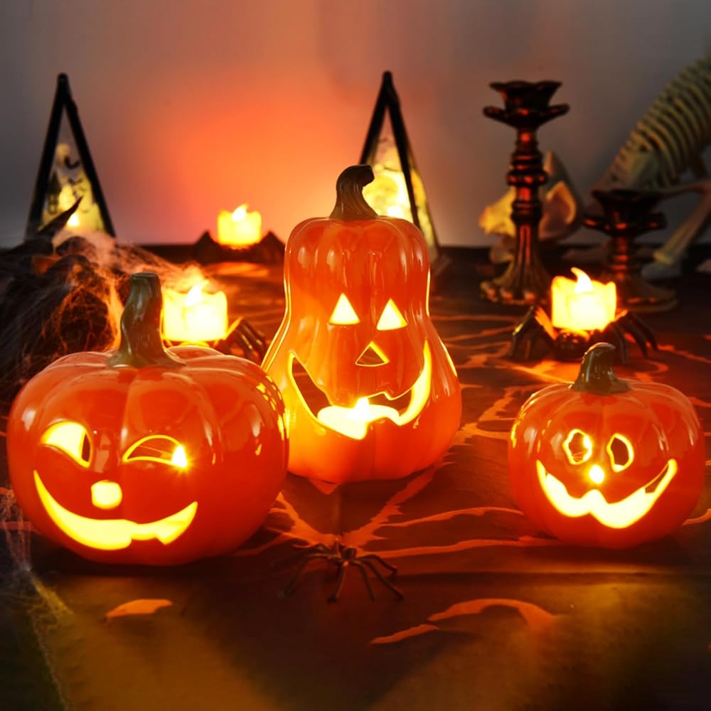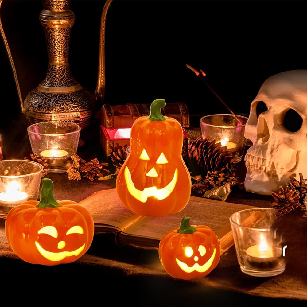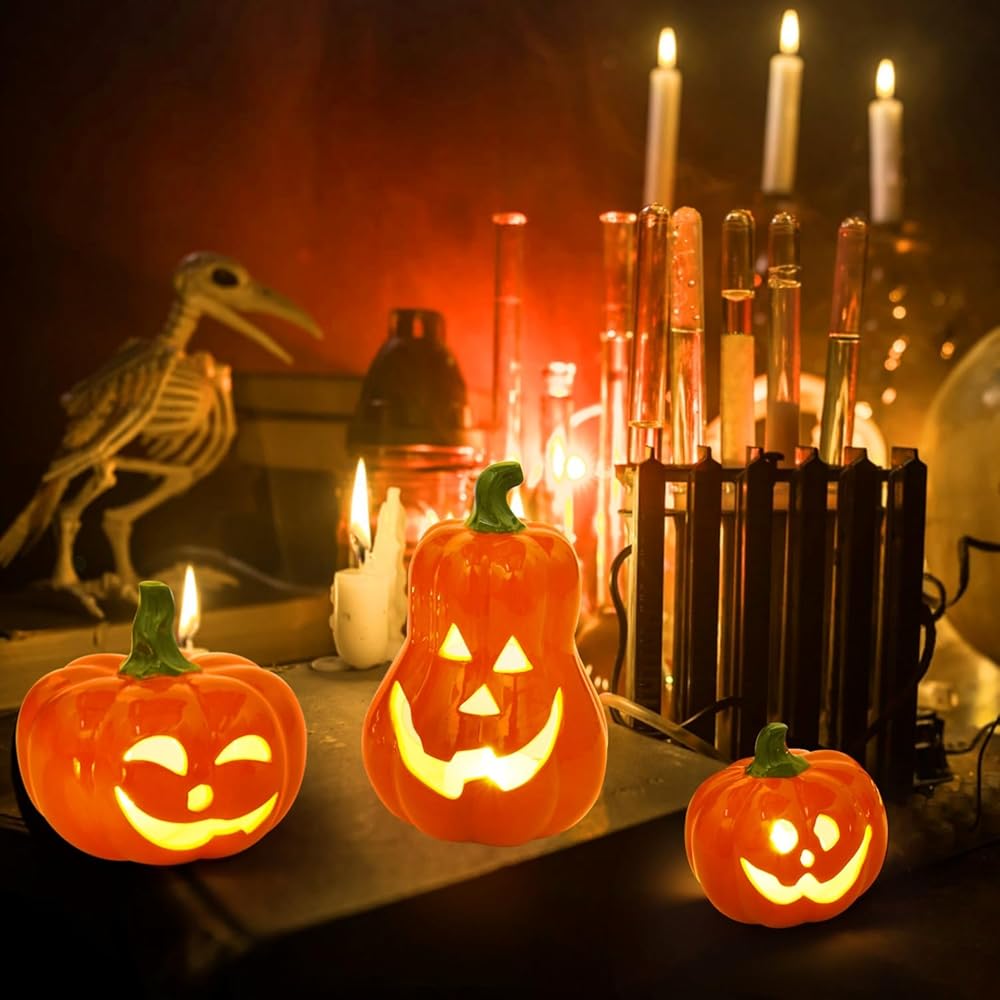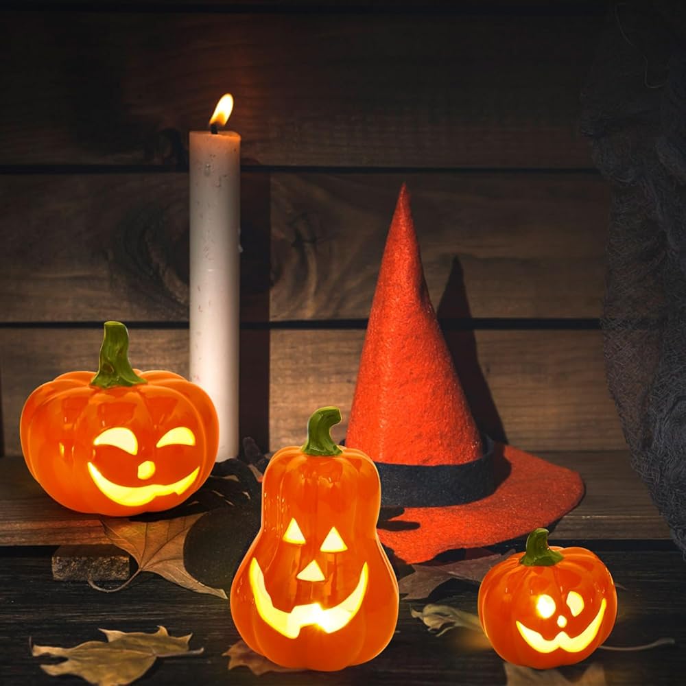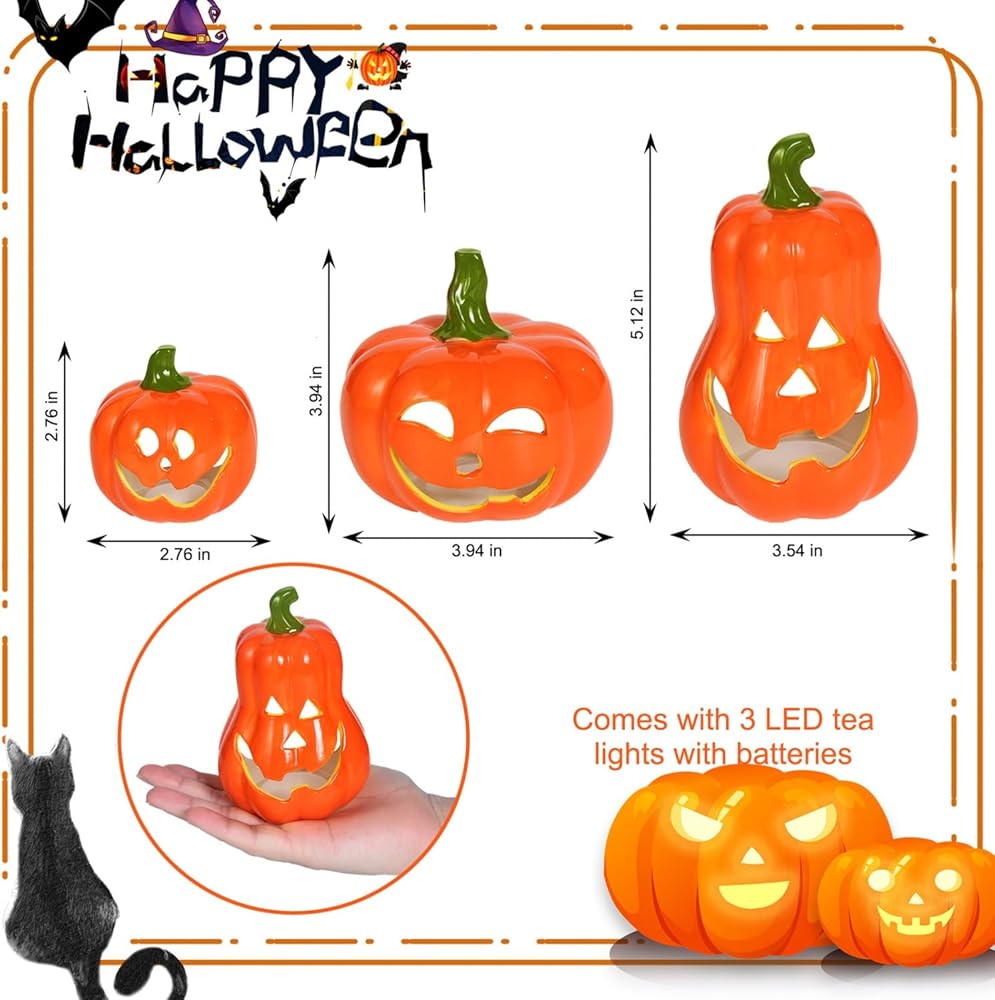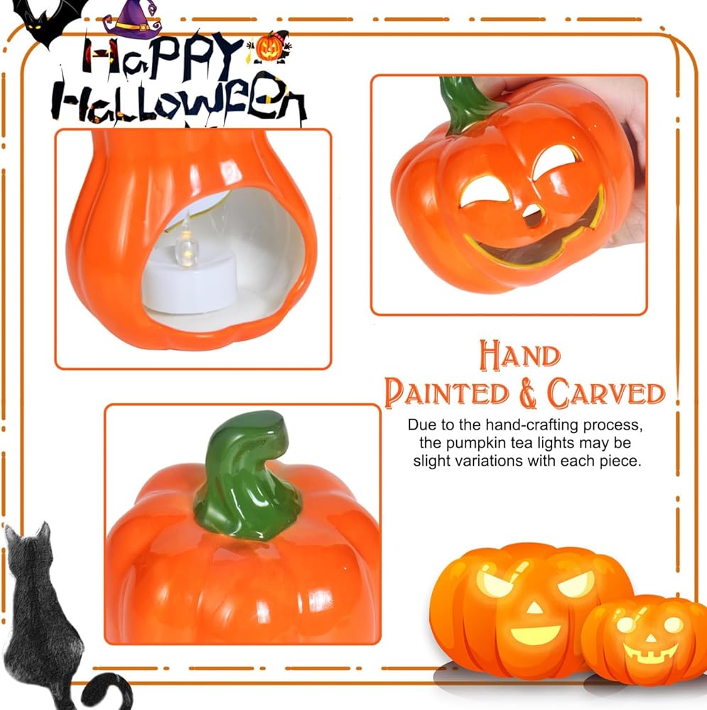 Adorable Halloween Decor: Are you looking for a classy and aesthetic way of decorating your home this Halloween? This beautified Halloween ceramic pumpkin Candle holder set with LED tea lights is the perfect solution for bringing the spook!