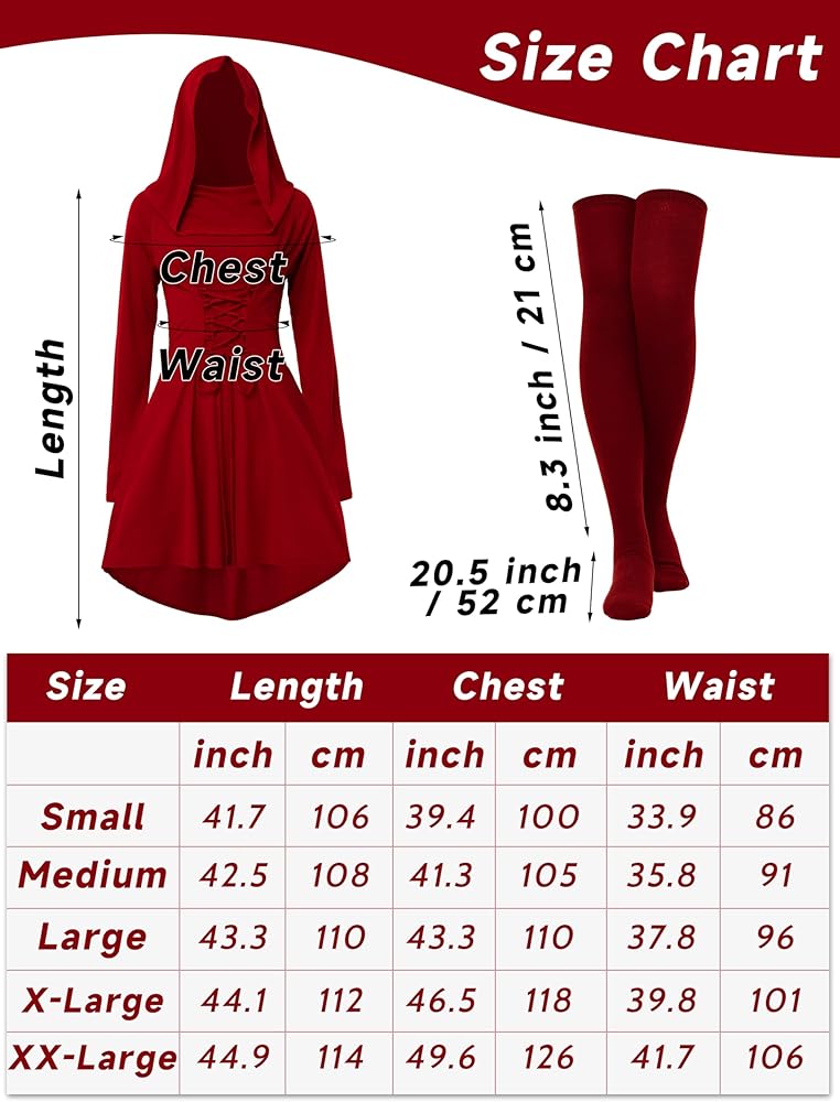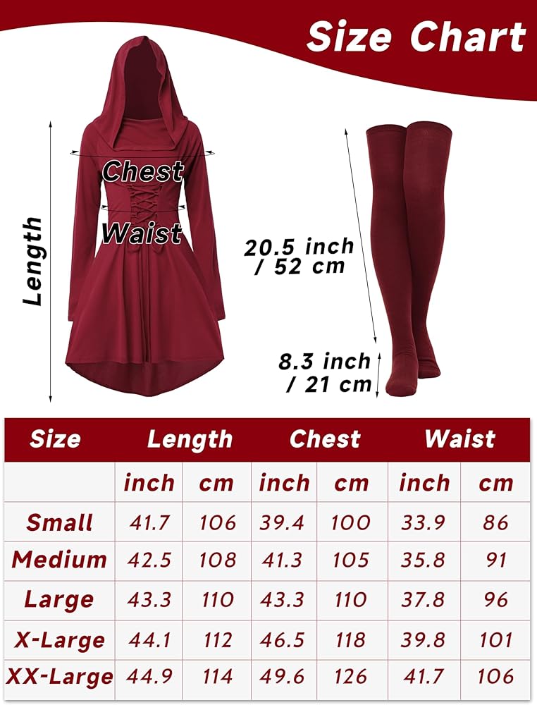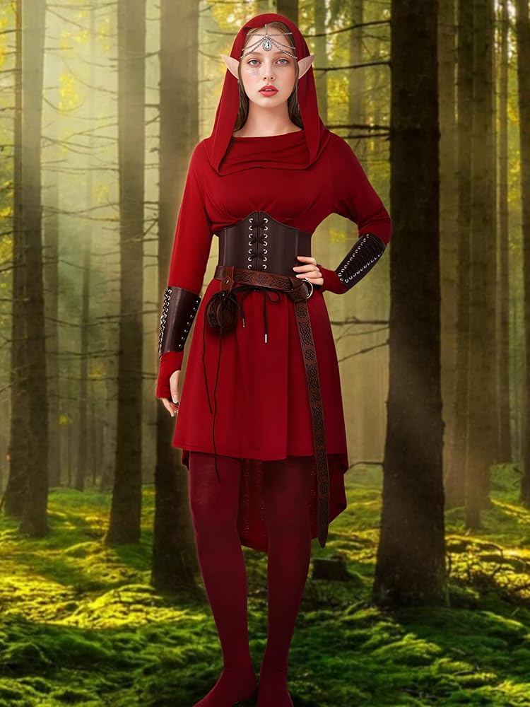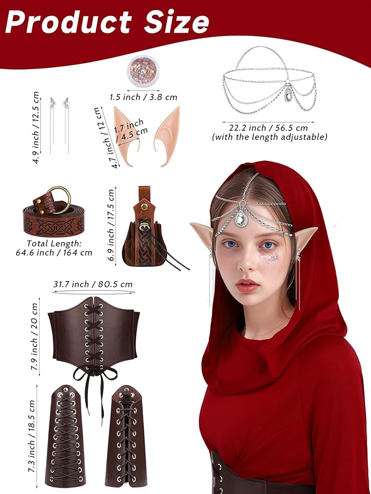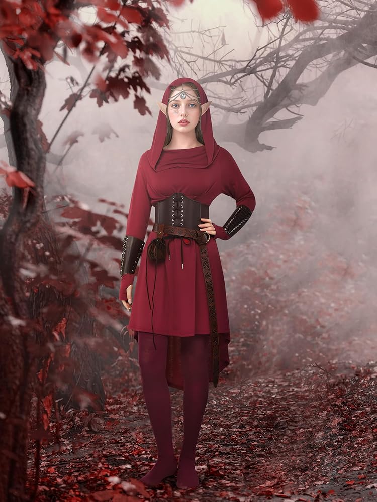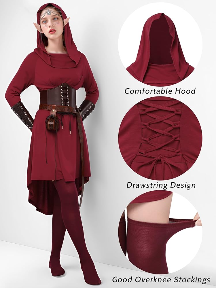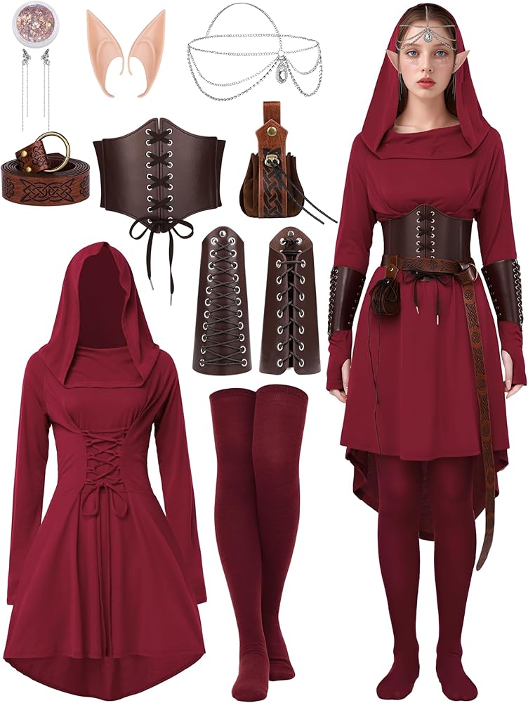 Medieval Renaissance Costumes: This meticulous collection includes: 1 hooded dress, 1 elastic corset, 1 belt, 1 pair of leather gloves, 1 leather pouch, 1 pair of long socks, 1 pair of elf ears, 1 elf headpiece, 1 pair of earrings, and 1 face glitter set—totaling 10 intricate pieces. Beautifully designed to meet your renaissance costume and cosplay needs for parties and events.
