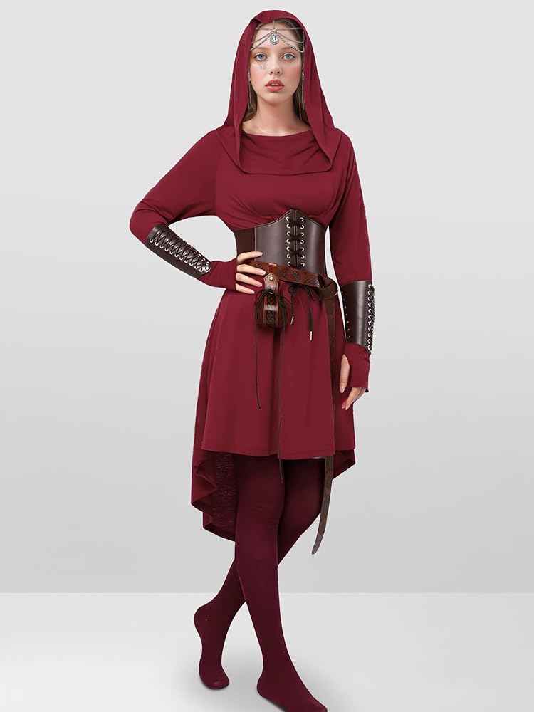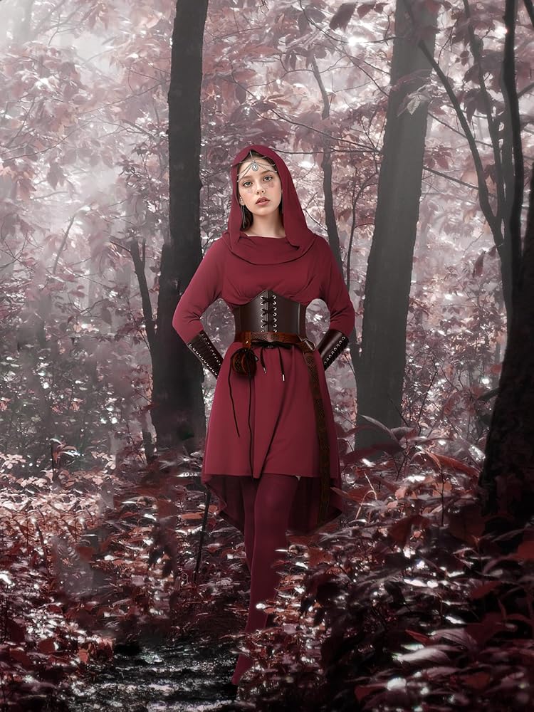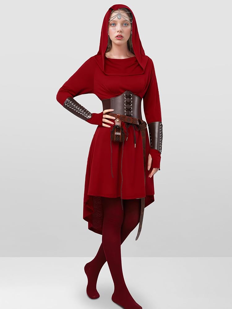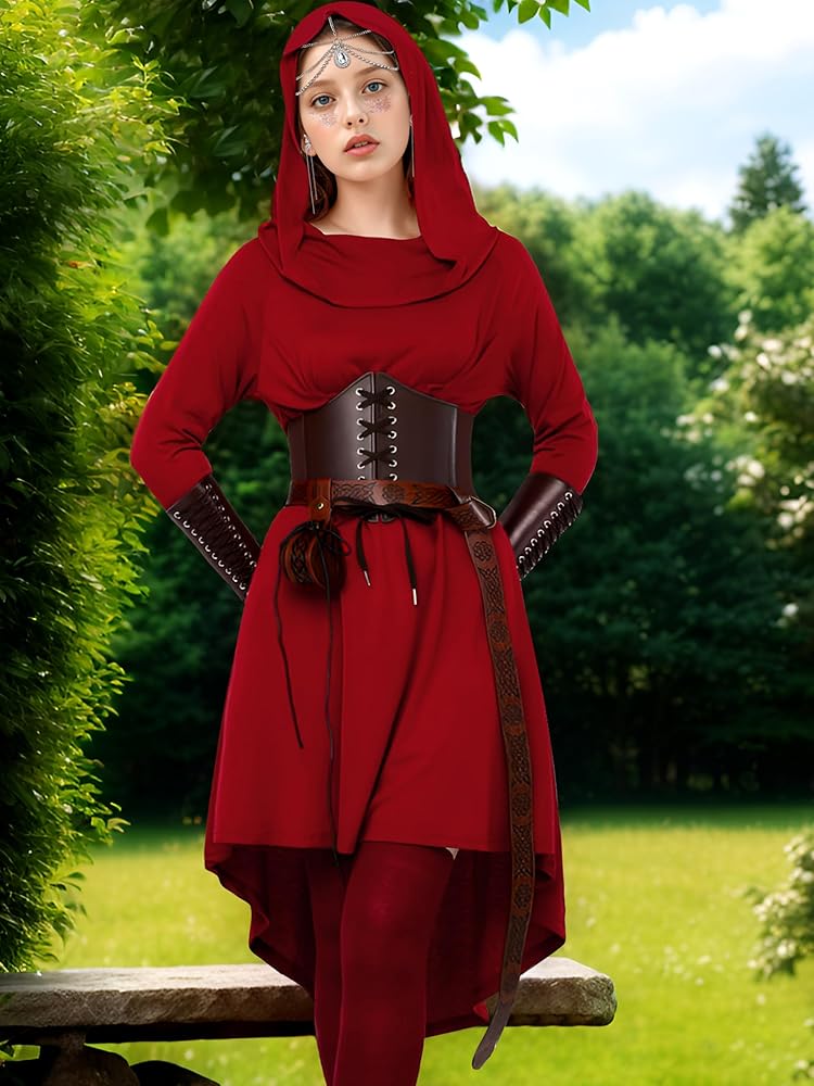Elegant Medieval Dress: Make a statement with our renaissance fairy costumes, featuring a stylish high-low hem, lace-up details on the front and back, a functional hood, and long sleeves with eye-catching design. The lace-up design on the chest not only highlights your figure but also adds a touch of elegance. Complemented by our leather corset, wrist cuffs, and other accessories, this outfit is ideal for Halloween and cosplay events, offering a blend of sophistication and historical charm.