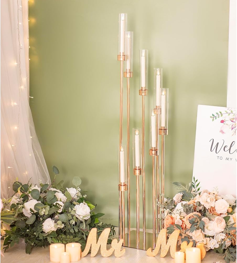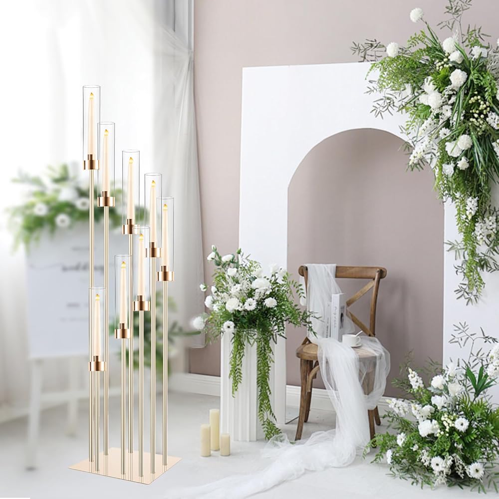 Tall Floor Candle Holder Set, 8-arm Metal Floor Candelabra Candle Holders, Large Gold Wedding Centerpiece, 45.3'' H Candlestick Stand with Acrylic Shade for LED Candles for Party Wedding Home Decor
