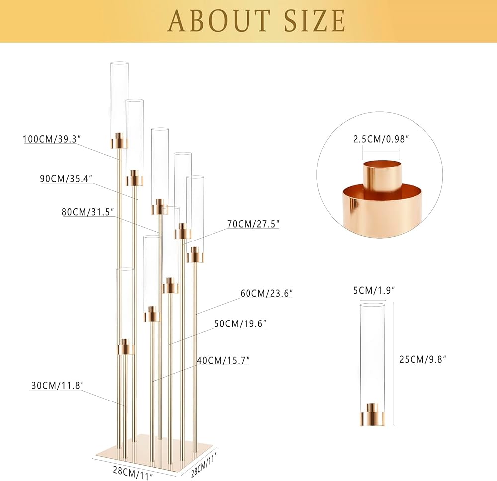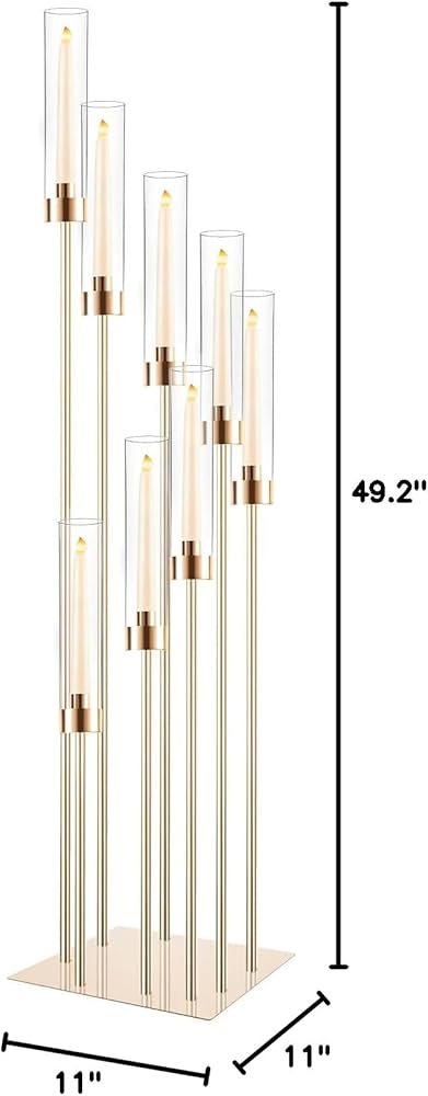 About our 8 Arm Floor Candelabra: The total height of this floor candlestick is 49.2 inches, and the height of the 8 arm high candlestick is 21.6/26/29.5/33.5/37.4/41.3/49.2 inches, including the height of the lampshade. Each candlestick holder includes 8 removable acrylic lampshades, with a height of 9.8 inches and a diameter of 2 inches.