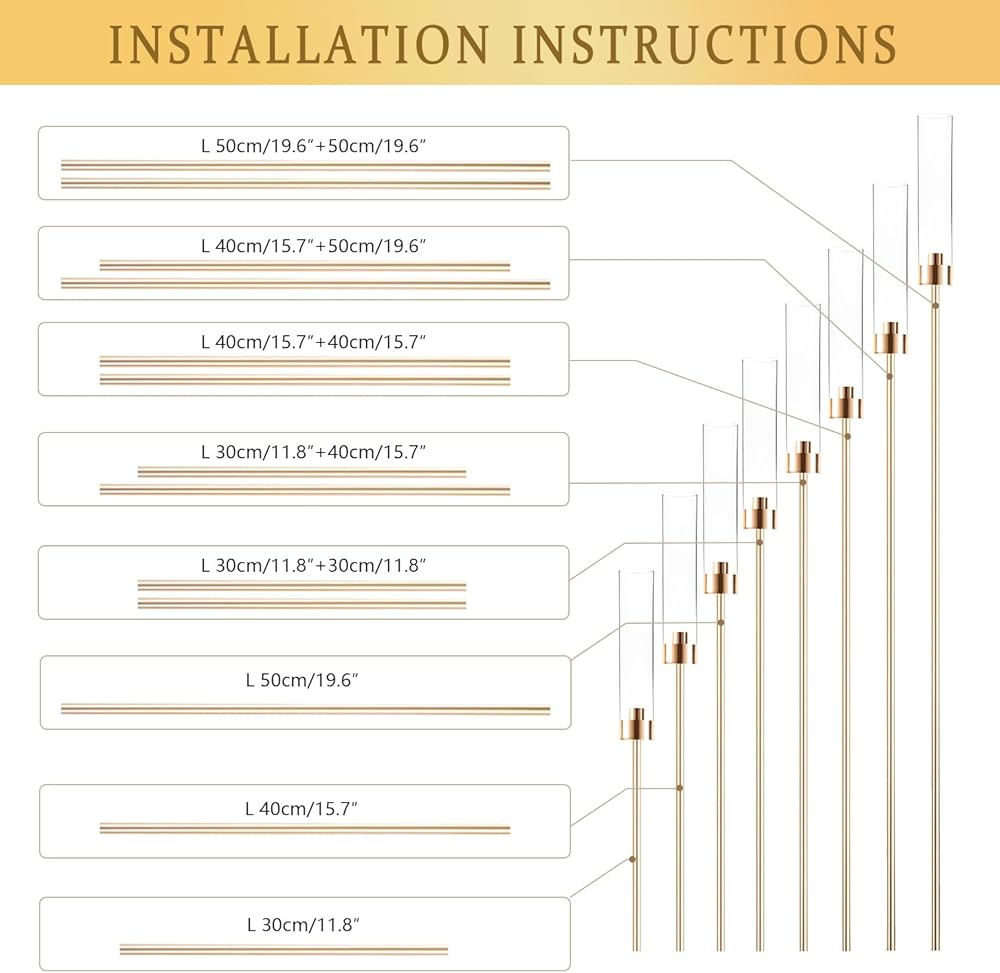 Easy intallation:This gold candlestick is separate when you receive, the two short rods are rotated to a length rod,One end of the pole is screwed to tighten the candle cup, and the other end is screwed to tighten the pole and the base.