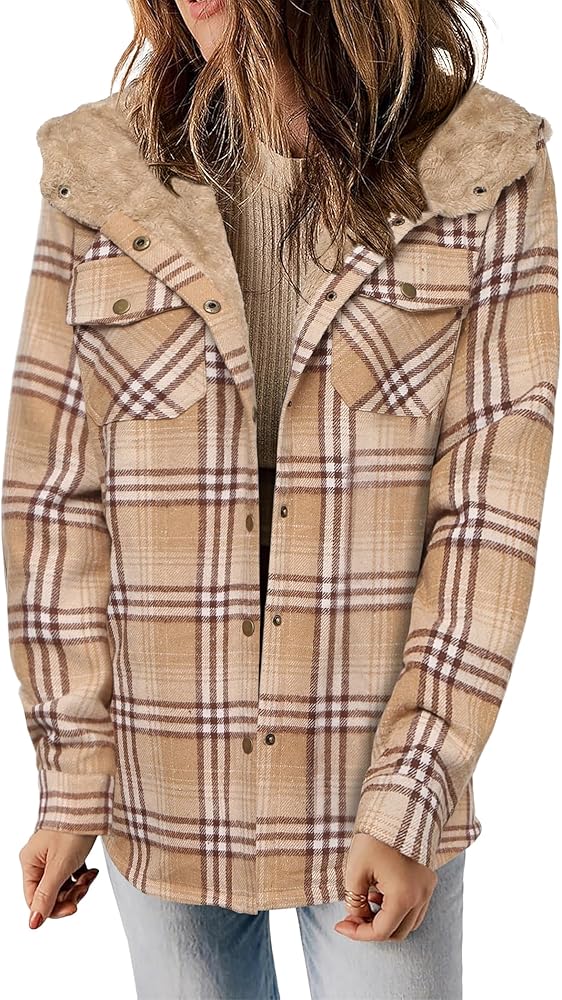 FEATURES:Sherpa Lined, Plaid Pattern, Hooded Design, Front Button Closures, Long Sleeve with Button Cuffs, Boyfriend Style. Loose fit add a touch of effortless style to your wardrobe.