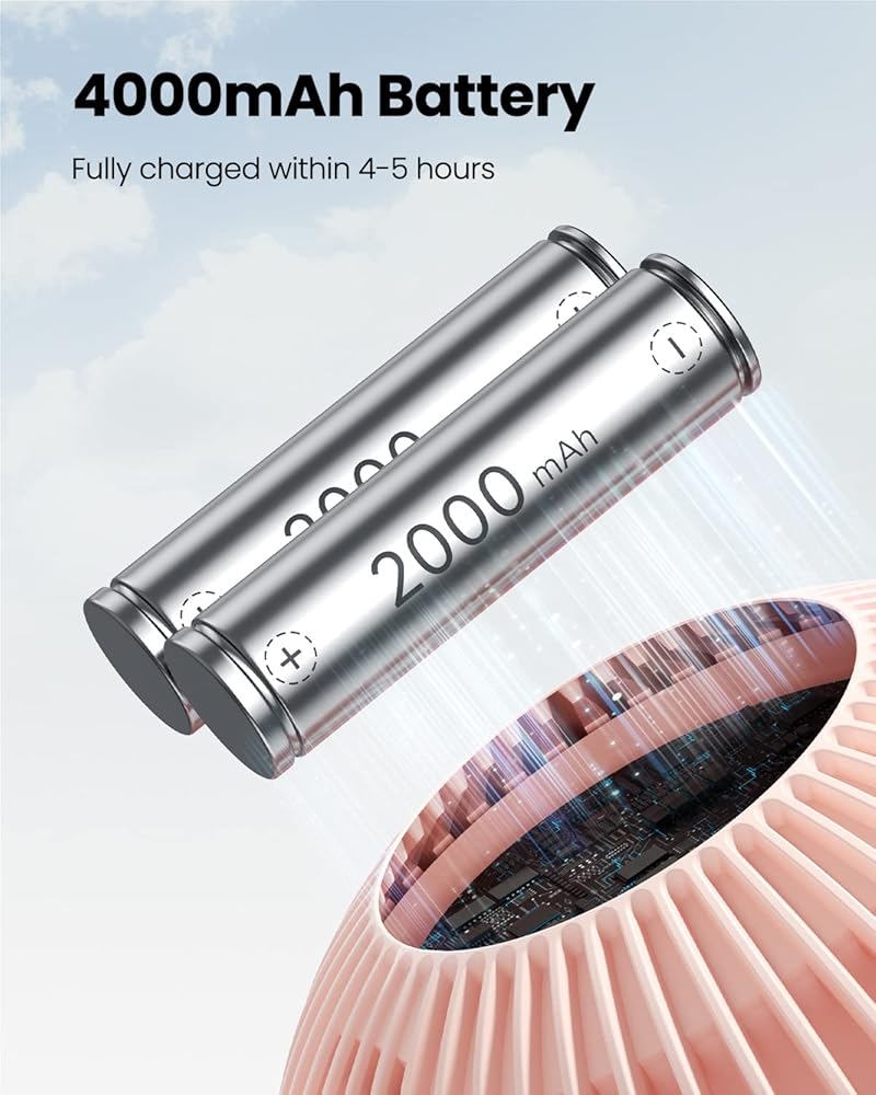 𝟒𝟎𝟎𝟎𝐦𝐀𝐡 𝐁𝐚𝐭𝐭𝐞𝐫𝐲 𝐚𝐧𝐝 𝟒.𝟓𝐇 𝐅𝐚𝐬𝐭 𝐂𝐡𝐚𝐫𝐠𝐢𝐧𝐠: This portable fan has 4000mAh large cell capacity, 𝐥𝐚𝐬𝐭𝐬 𝟑-𝟏𝟐 𝐡𝐨𝐮𝐫𝐬 depending on the 4 speeds, and fully charged within 4.5 hours. The small fan is charged by a quality USB Type-C port