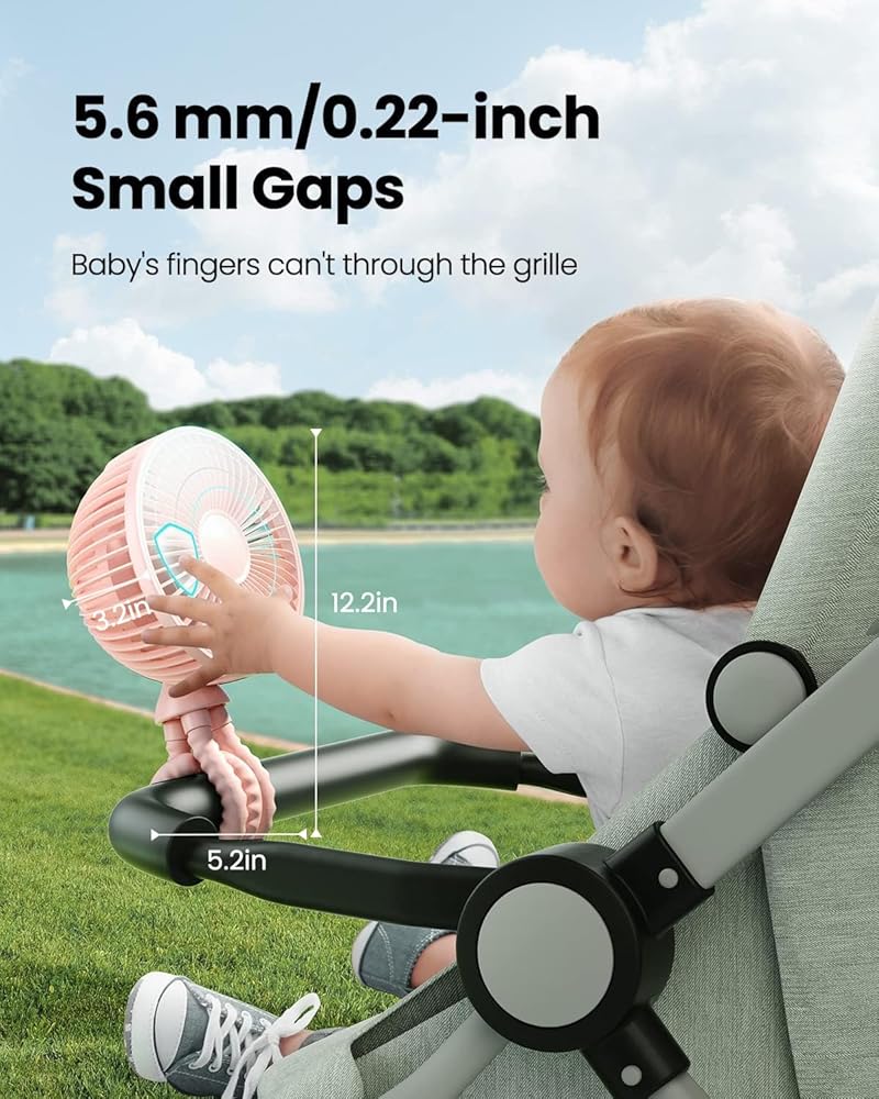 𝐔𝐩𝐠𝐫𝐚𝐝𝐞𝐝 𝐓𝐫𝐢𝐩𝐨𝐝 𝐚𝐧𝐝 𝟓.𝟔𝐌𝐌 𝐒𝐚𝐟𝐞 𝐆𝐚𝐩 𝐟𝐨𝐫 𝐁𝐚𝐛𝐲: The entire arms of this handheld fan are 𝐝𝐮𝐫𝐚𝐛𝐥𝐞 𝐬𝐢𝐥𝐢𝐜𝐨𝐧𝐞 for great grips. The gap of baby fan is only 5.6MM, smaller than other desk fans, and really safe for little fingers. Great fans for baby infants and toddlers