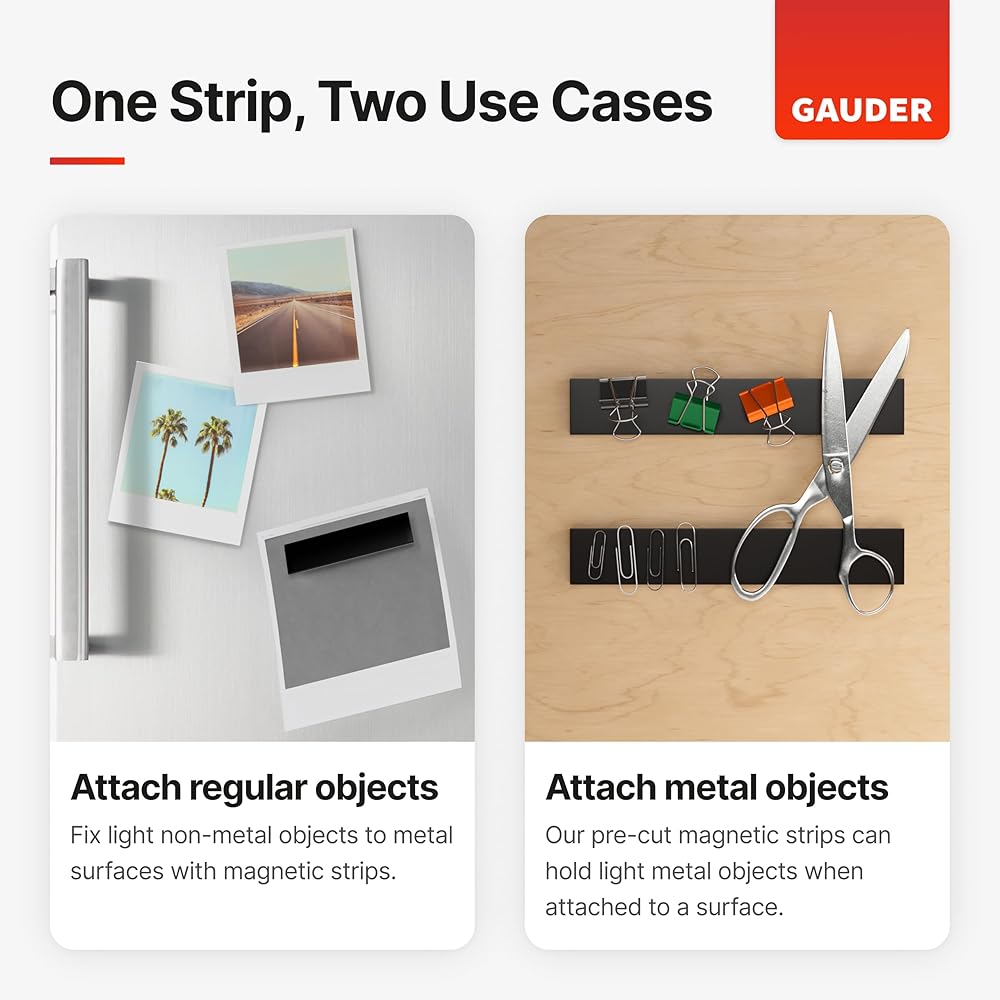 - Dual application option: use GAUDER adhesive magnetic strips to attach non-magnetic objects to magnetic surfaces or to make metallic objects stick to the craft magnet.