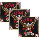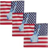 This is a set of 3 cotton bandanas in American flag print. These Bandanas can be used as hair covering, headband and necktie. It measures 21 inches by 21 inches.