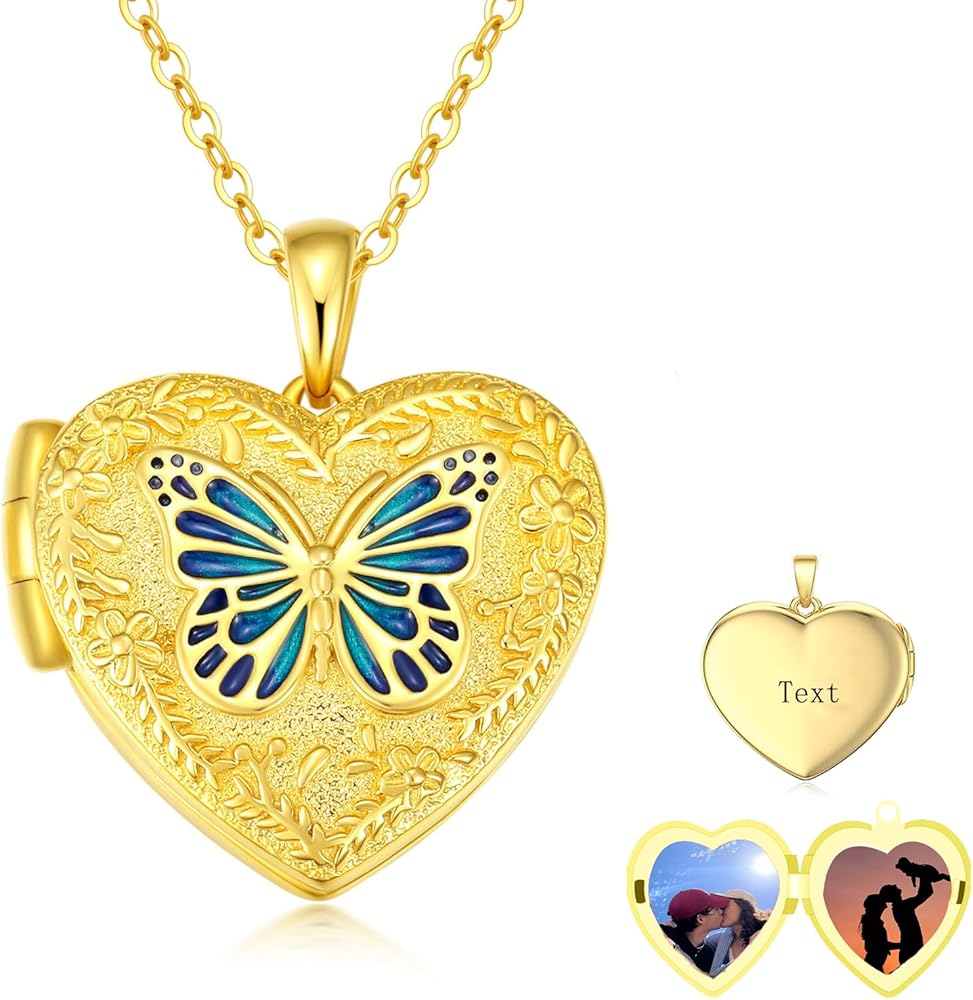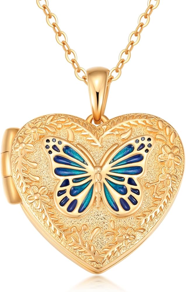 Butterfly Heart Locket Necklace, 925 Sterling Silver 18K Gold Plated Heart Locket, Holds 2 Photos Locket Necklace