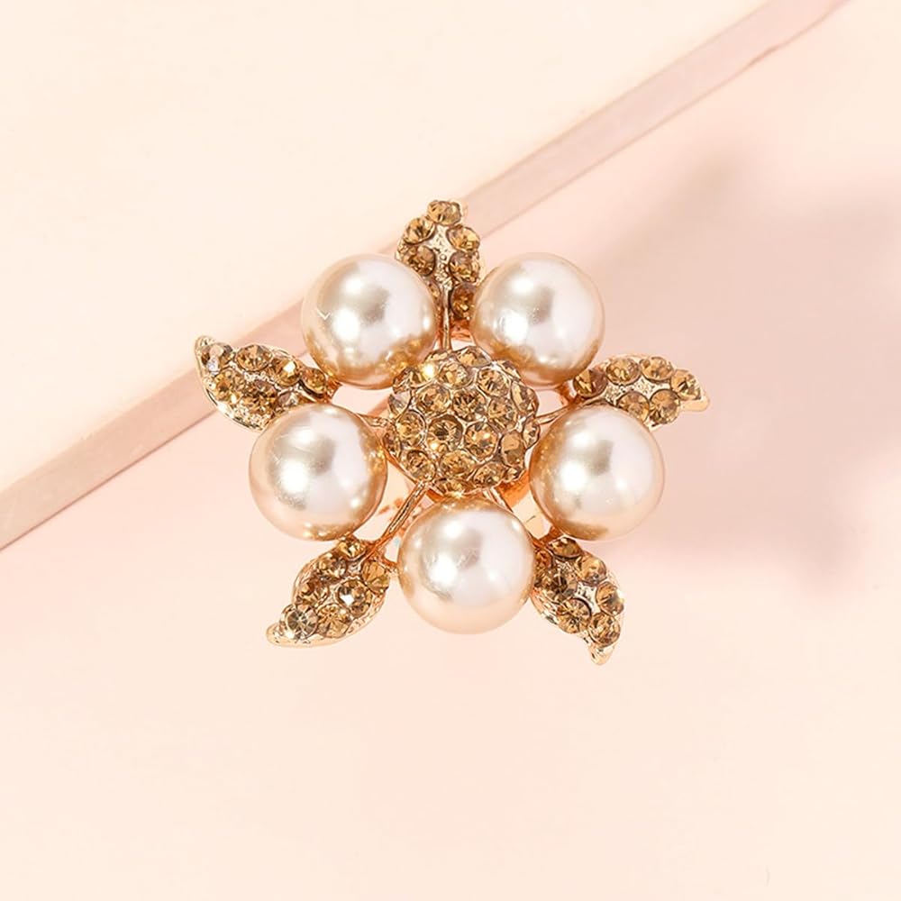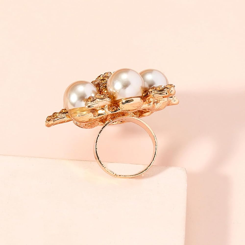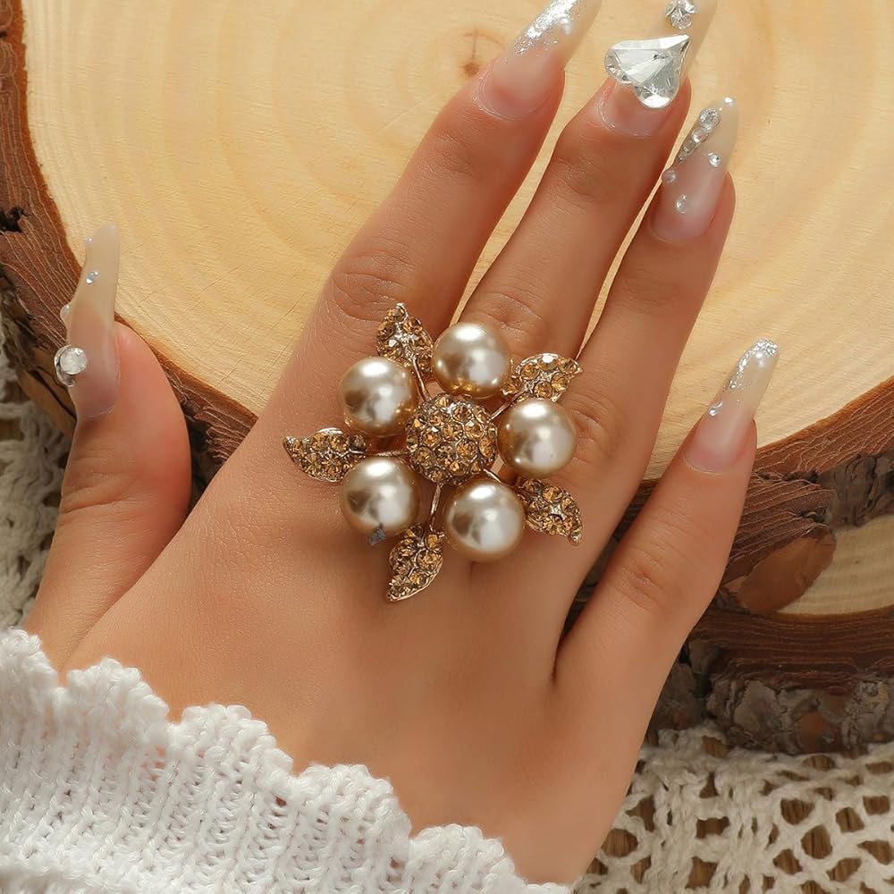 Crystal Pearls Flower Statement Rings ——This pearl flower ring has two colors for you to choose gold and silver, sparkling rhinestones with five large pearls is very fashionable and delicate, is most women's favorite jewelry accessories, can enhance a person's temperament.