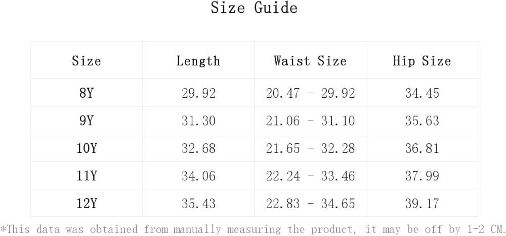 12Y:Hip Size:39.2IN,Length:35.4IN,Waist Size:22.8-34.6IN