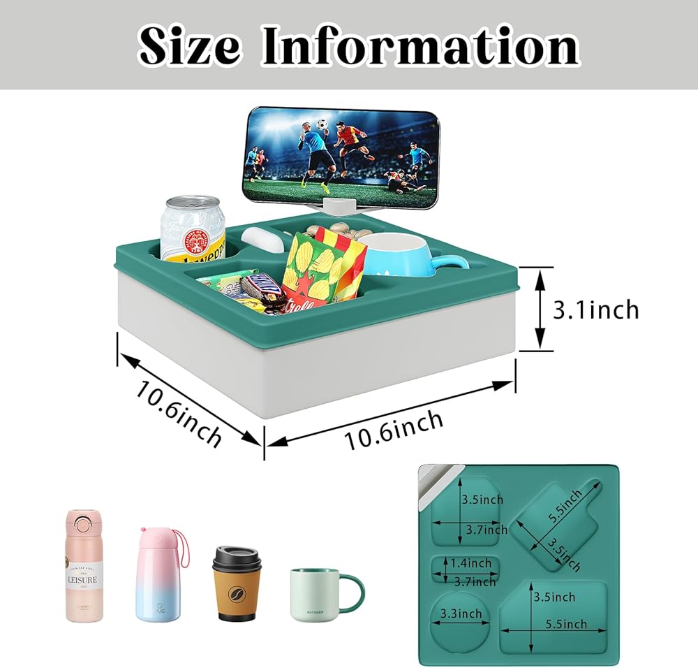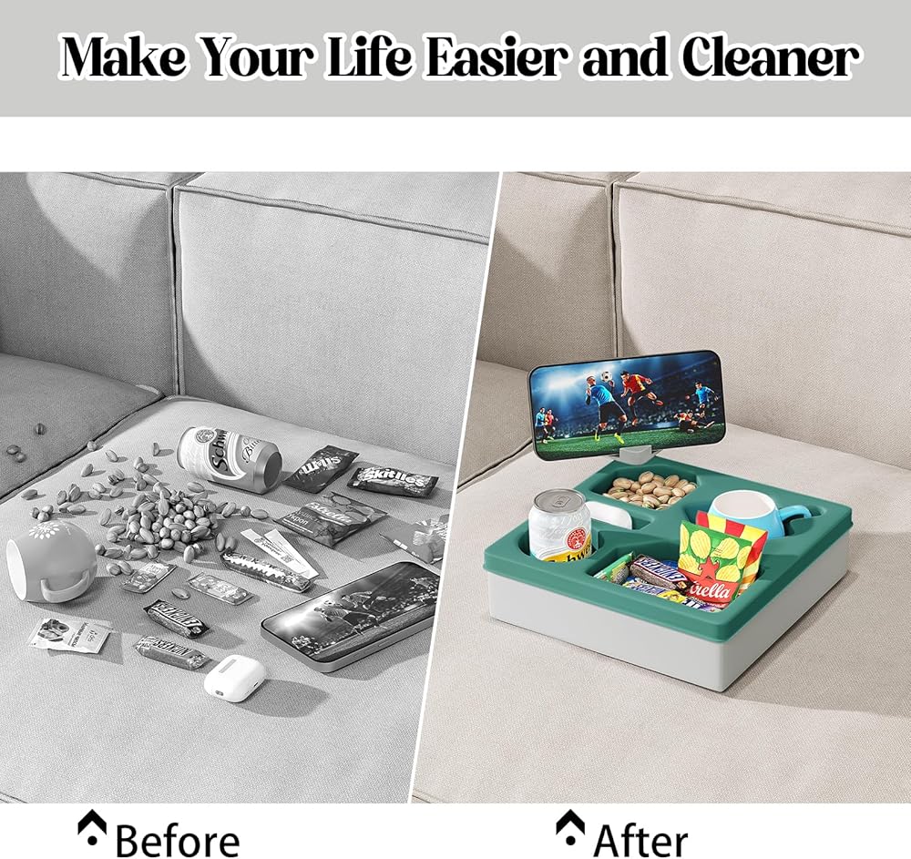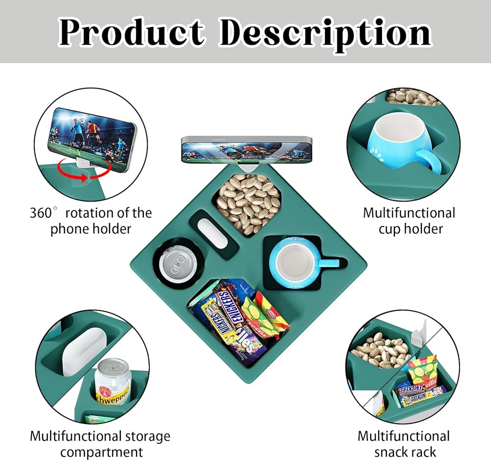 【Multi-Functional Design】: The Zxyculture Couch Caddy combines convenience and versatility. It features a rotatable phone holder, multiple compartments for snacks and beverages, and a secure space for remotes. Perfect for use on the couch, bed, car seat, or outdoor picnics.