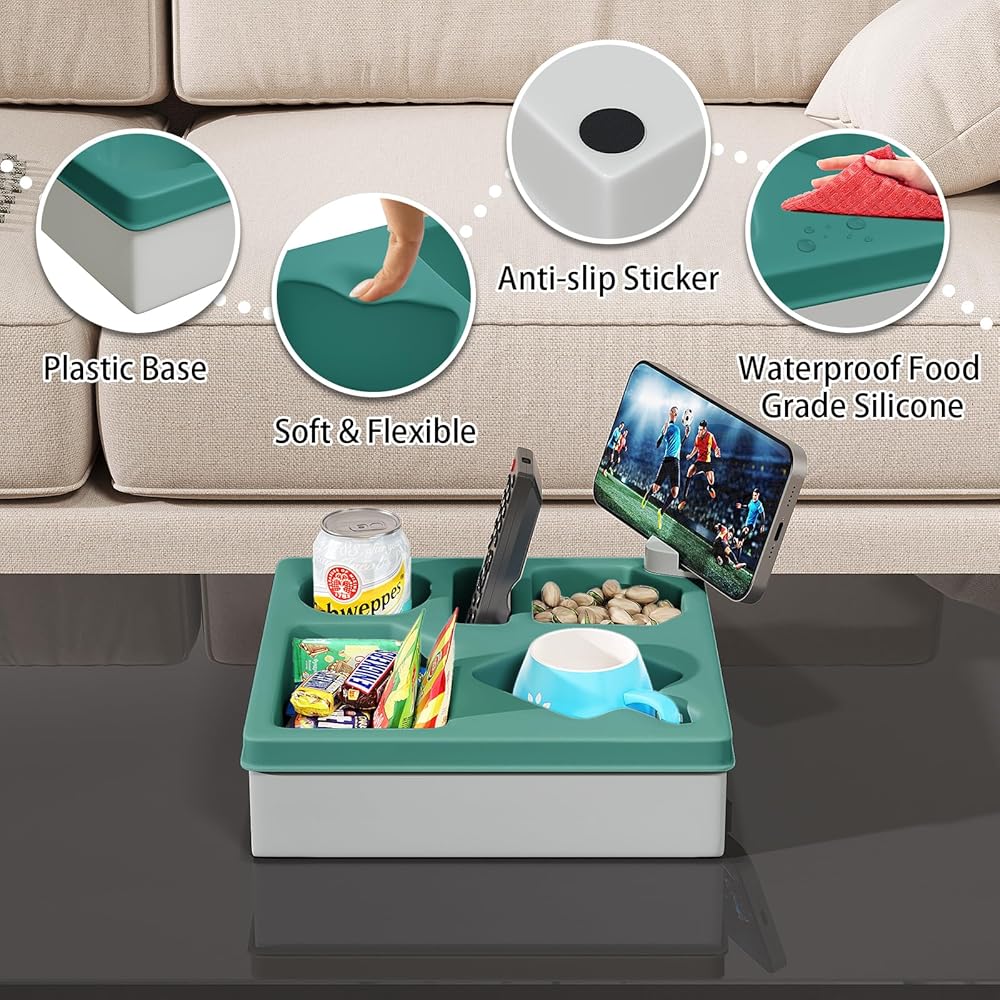 【Durable and Waterproof】: Made from high-quality, waterproof materials, this couch cup holder tray is designed to withstand spills and daily use. Its anti-slip base ensures stability on any surface, keeping your items safe and secure.