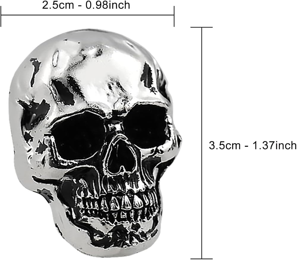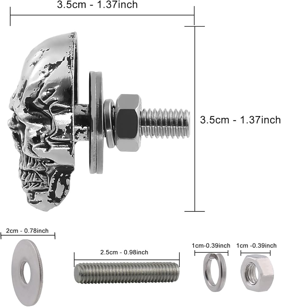 Skull license plate screws size: width 2.5cm-0.98inch/height 3.5cm-1.37inch, length 3.5cm-1.37inch, net weight 21g each.