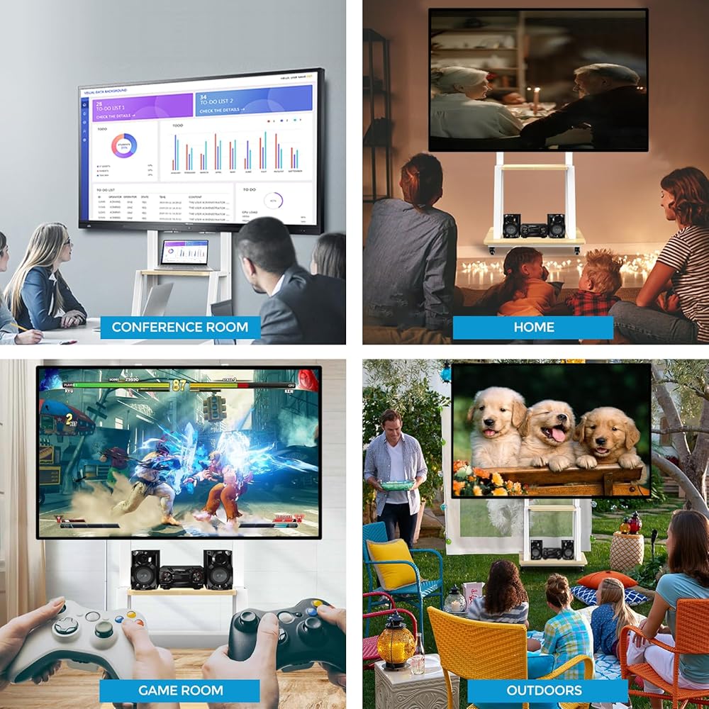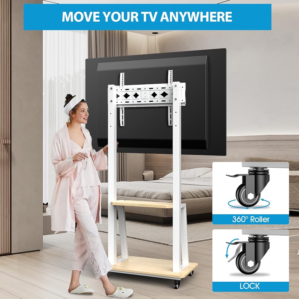 Featuring lockable wheels: mobile TV cart with wheels. Make your TV mobile. Move it to where you want.You just rolled it back when you don't need this mobile TV cart.With locking wheels,Features lockable caster wheels for easy mobility and added security. Making sure it stays put when it reaches its destination.Perfect for home,bedroom, office, shopping mall, conference room,outdoor and more.
