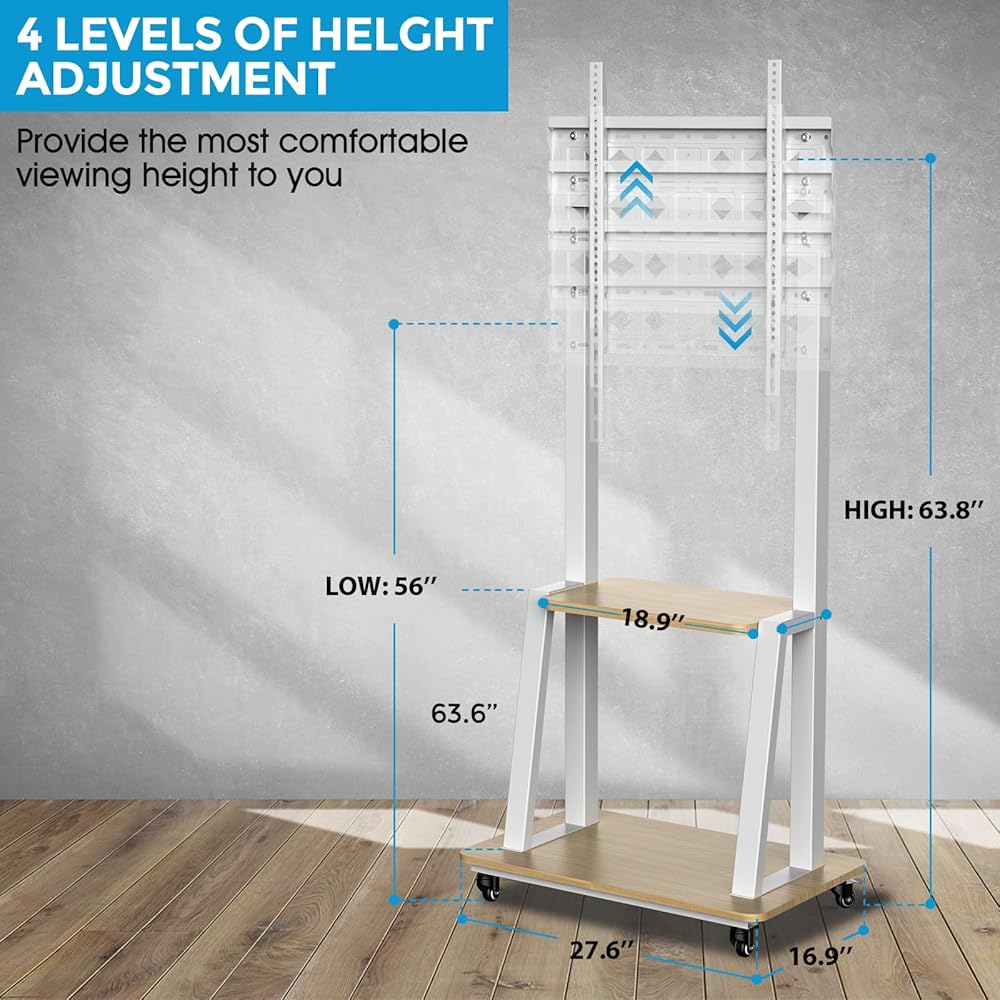 Adjustable Height and Mid-Shelving Design: The overall size mobile TV cart is 27.6"W x 16.9"D x 60.1"H. There are 3 height configurations that allow you to choose a comfortable viewing height to watch TV. The minimum height is 45.2" while the maximum is 53.1". 2-tier shelves, the bottom shelf is 27.5" x 16.9", and the middle shelf is 18.9" x 11.2", providing ample space for your game consoles, DVD player, or sound systems.