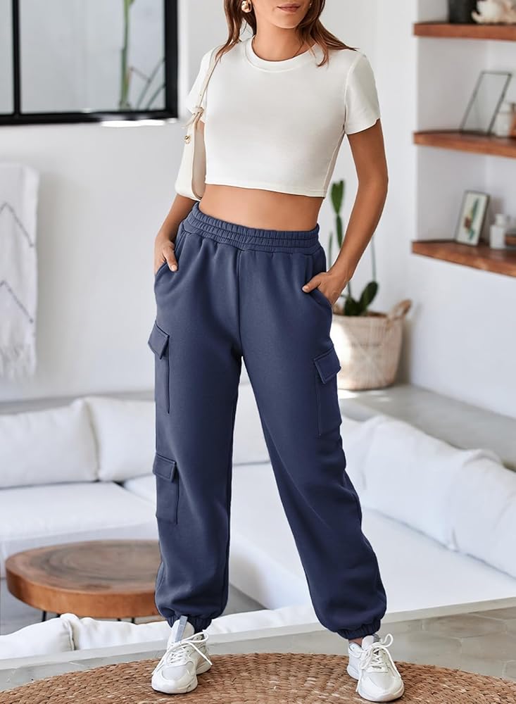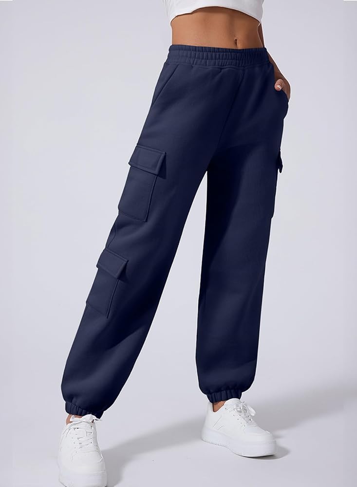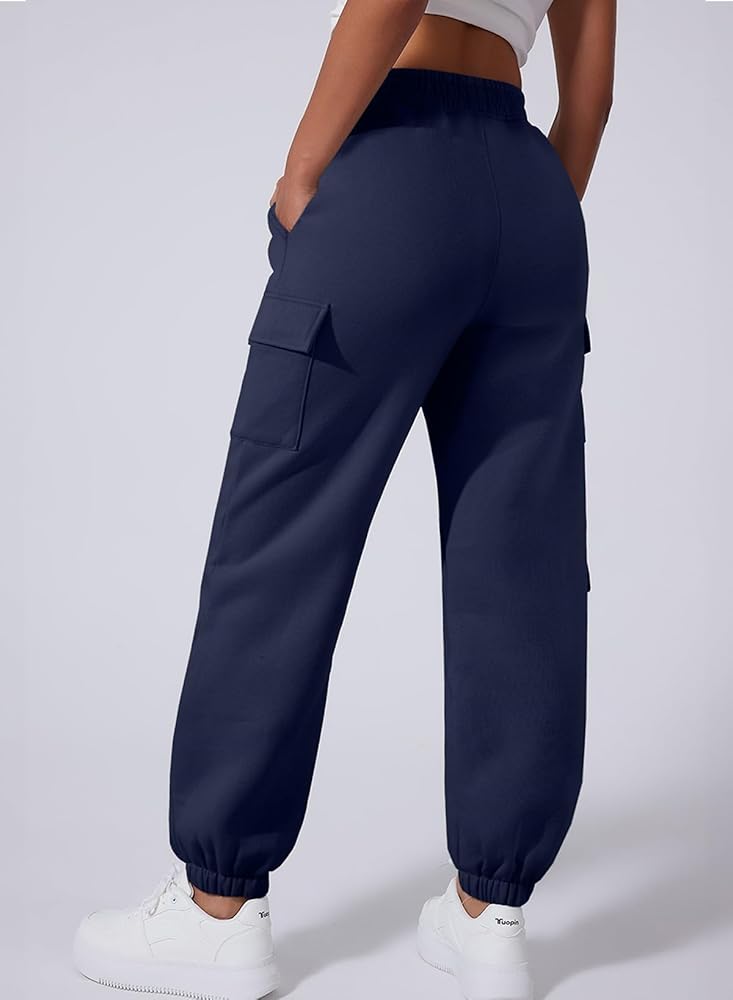 Design: These fleece-lined sweatpants feature a cargo-inspired design with multiple pockets for ample storage. The high-waisted, tapered fit offers a relaxed, flattering silhouette that suits a variety of leg lengths.