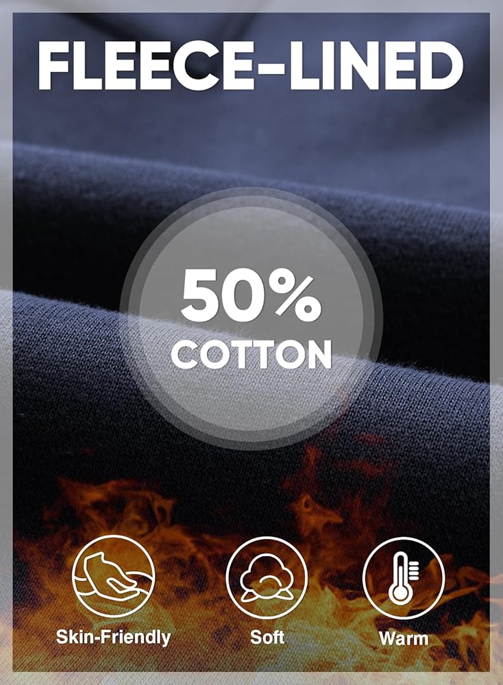 50% Cotton Blended & Fleece Lined: These cargo joggers feature a 50% cotton and 50% polyester blend with a soft fleece lining for warmth. Their quality construction provides a tailored look, while the cotton ensures breathability and comfort.