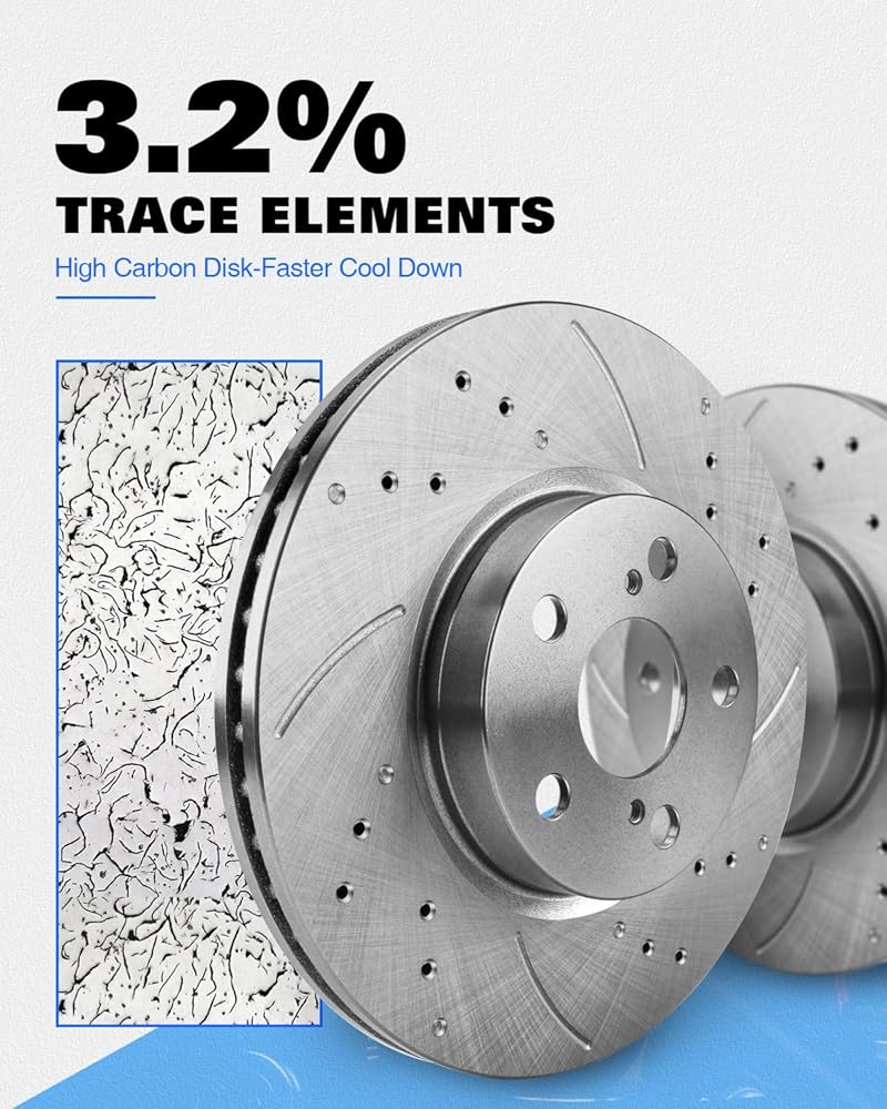 [Asbestos-free High-carbon Ceramic Brake Pads]: With the concept of safety and customer satisfaction as the top priority, it has achieved quieter, low dust, and high-temperature resistance characteristics. Drilled slotted frenos delanteros, effectively reduces heat attenuation, prevents uneven wear and warping of the brake rotor, and provides excellent braking performance for your driving.