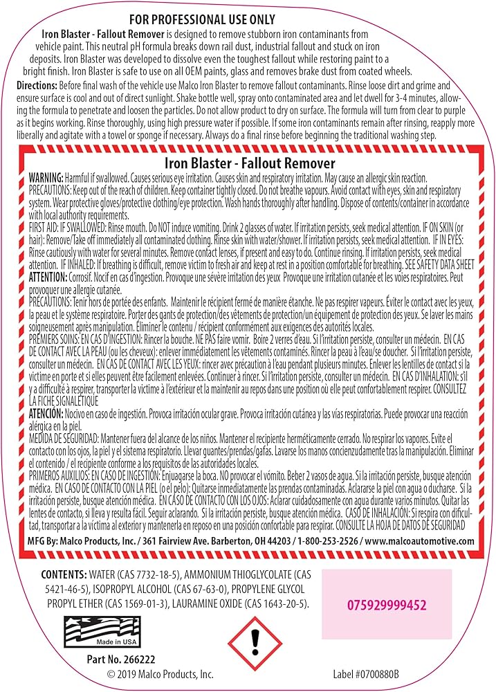 Malco Iron Blaster Fallout Remover - Dissolves Contaminants from Vehicles Such as Rail Dust, Industrial Fallout and Iron Deposits/Restores Paint to a Bright Finish / 22 Oz. (266222)