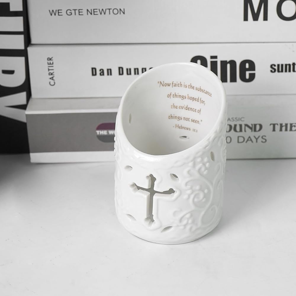 Tea light candle holder in beveled cylinders style, white holder with carved cross on front, floral pattern around the surface, gold painted verse can flicker by candlelight, with lights through the cross shape added an elegant and divine touch to your room