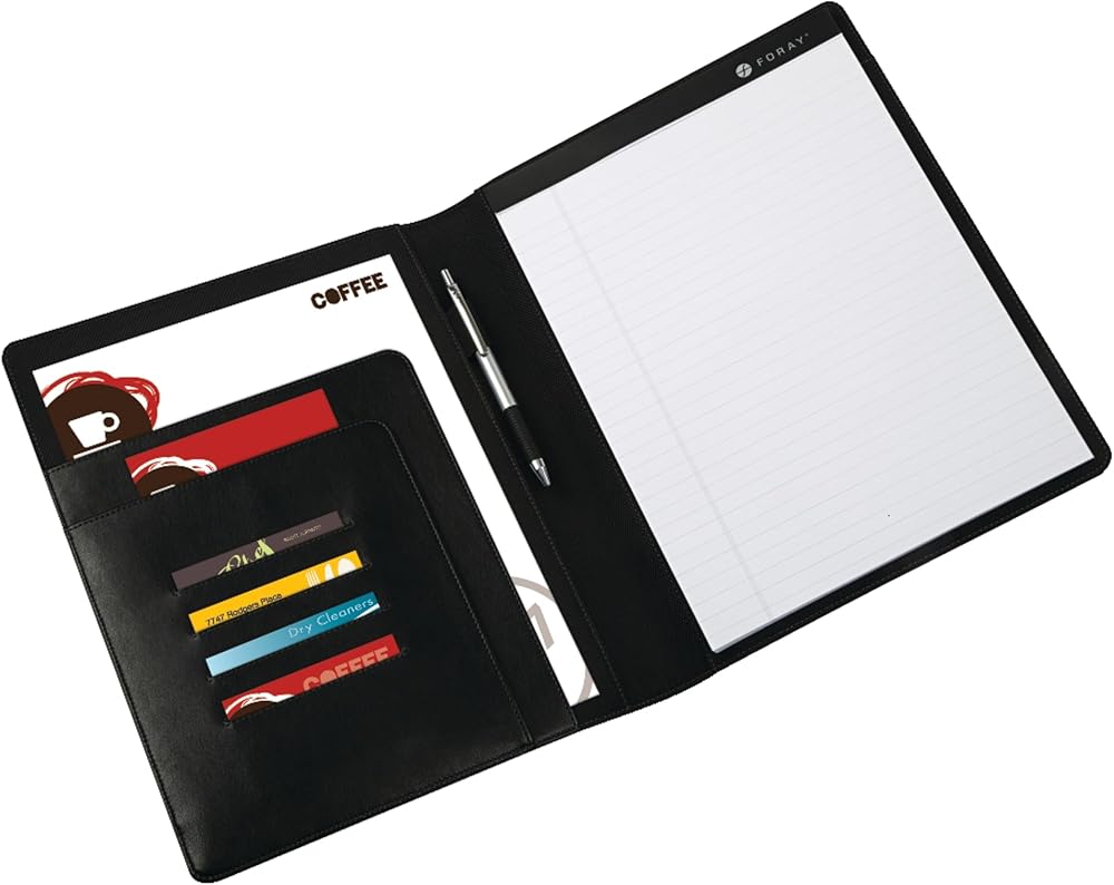 Prepare for business meetings or conferences with this Office Depot padfolio. The integrated business card holders offer easy access to contact information, while the side pocket provides convenient storage for forms, applications and other paperwork. A large writing pad creates space for you to jot down memos and reminders. This Office Depot padfolio boasts a loop to hold your favorite fountain or ballpoint pen securely in place. Black finish offers a timeless look. Side pocket adds storage for paperwork and other items. Writing pad lets you put your thoughts on paper.