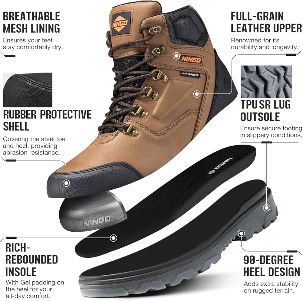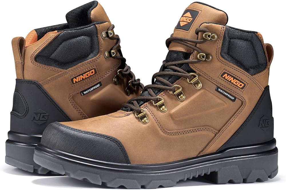 [Heavy-Duty Work Boots]: Hardworking comfort at its best! These NINGO Men's safety steel toe work boots offer exceptional stability, superior cushioning, excellent shock absorption, and protection. Engineered for maximum support and durability, they provide reliable waterproof performance and all-day comfort, making them ideal for construction, factory, harsh outdoor work environments and oil and gas exploration.