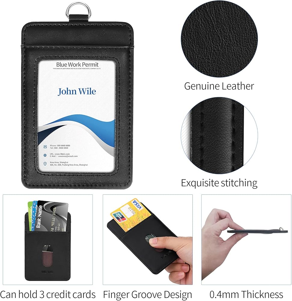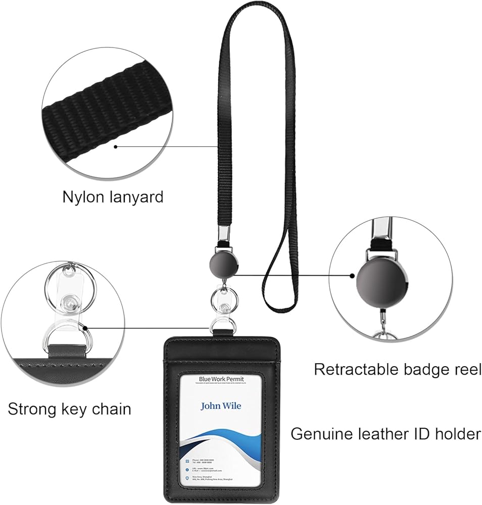 Genuine Leather ID Badge Holder with Retractable Lanyard, Retractable Badge Reel Nylon Lanyard and Vertical ID Card Holder with 1 Card Slot Key Chain for Men Women, Black