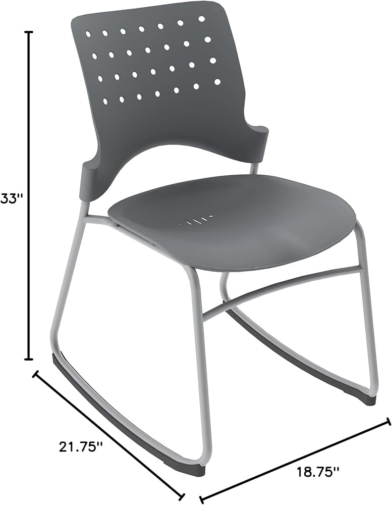 SPECIFICATIONS: The overall dimensions of the stackable rocker chair measures 21.75” D x 21.75” W x 33” H, seat dimensions 18.25” D x 18.25” W x 18” H, and weighs 13.5 lbs