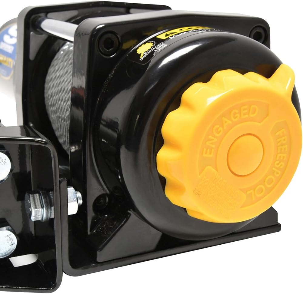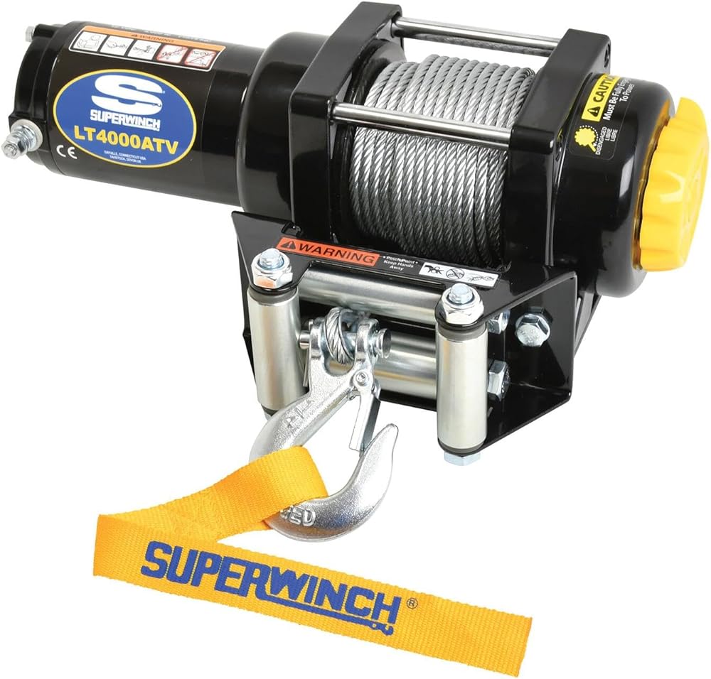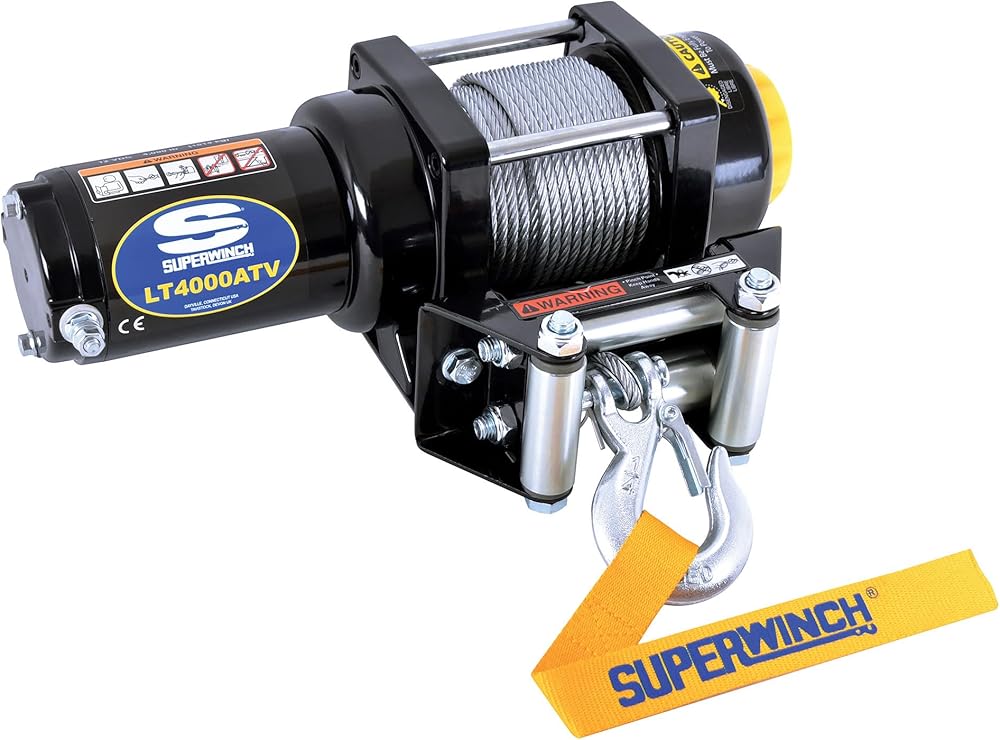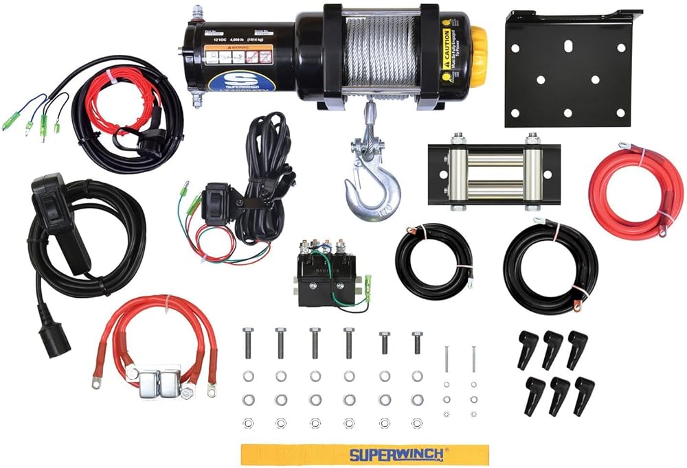 4,000 lbs, 12 VDC, 50 ft synthetic rope, sealed solenoid, 12 ft handheld remote control and handle bar switch, 1.4 Hp, automatic load holding brake, 3-stage planetary, 166:1 gear ratio, 4-way roller fairlead