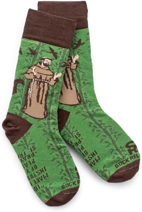 Sock Religious Rebuild God's Church St. Francis of Assisi Brown and Green Men's and Women's One Size Fits Most Polyester Blend Catholic Inspirational Fun Crew Socks, Adult