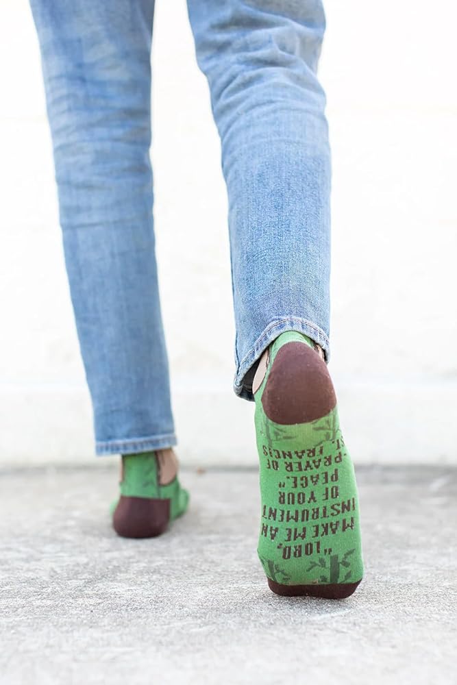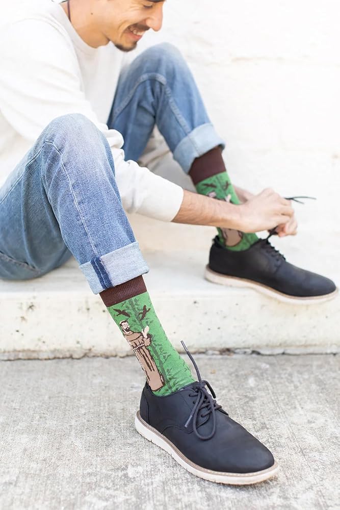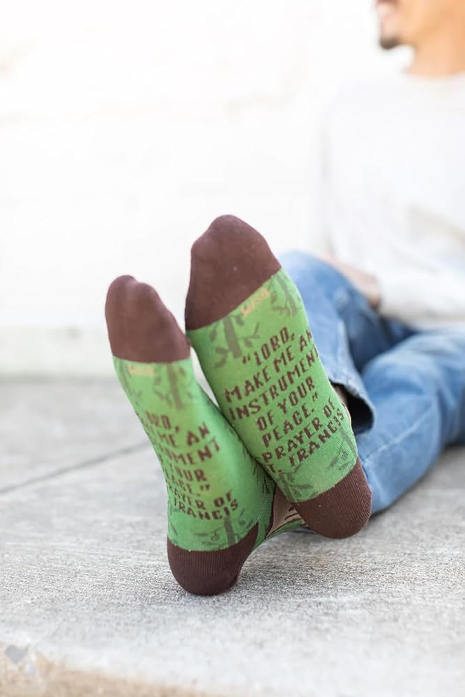 St. Francis of Assisi socks will remind you to trust in the Lord for all your needs, big and small, and to follow the call of God to lead to your deepest joy and freedom; His love for nature, his simple poverty, and deep trust and reliance on the Lord are great examples to us today; Francis was obedient to God and followed his call away from the glory of a soldier to eventually be the man to "Rebuild God's Church"
