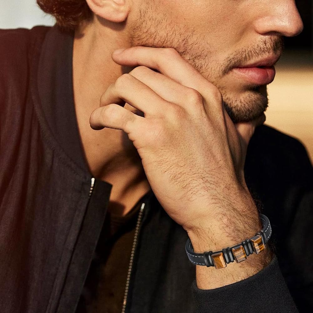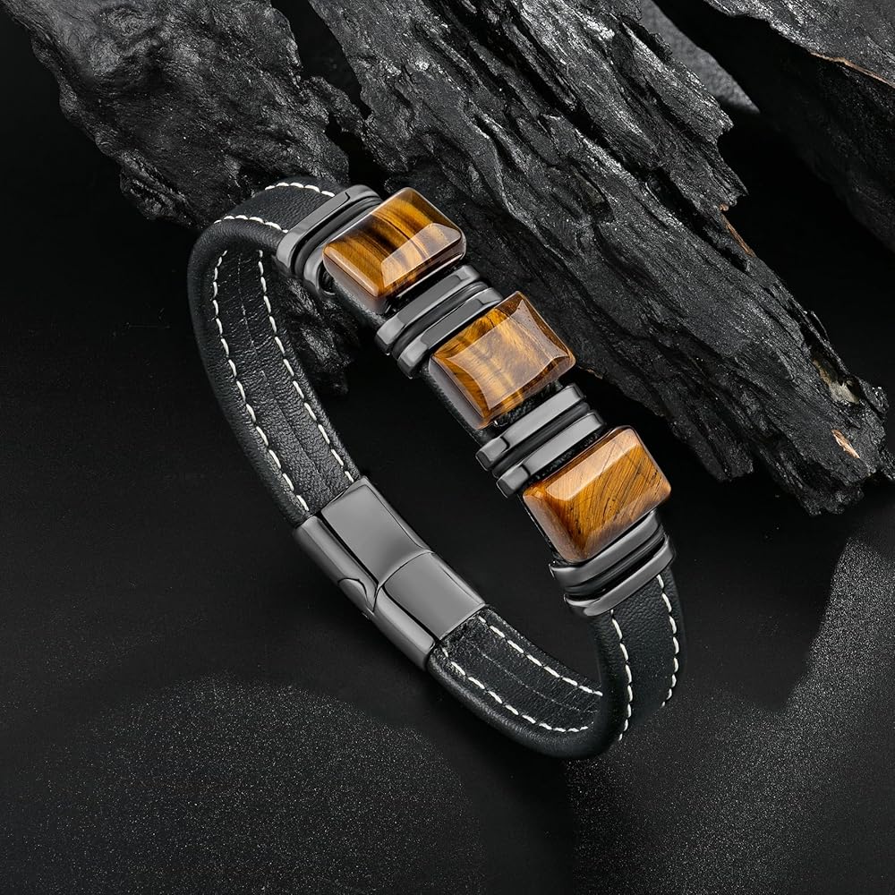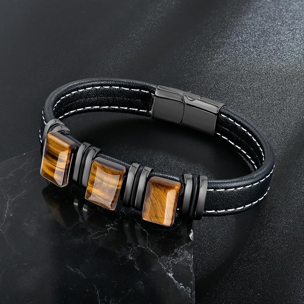 Design:The leather bracelet is made of three natural tiger eye stone with a black leather classic design,adding a touch of sophistication to any outfit. Natural tiger eye stone represents courage and confidence, with tiger-like observation and insight, improves overall balance and mood, releases fear and anxiety, and brings good luck.
