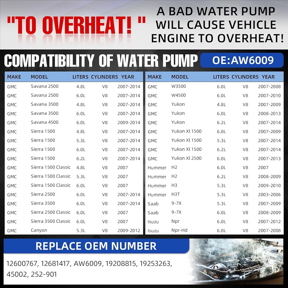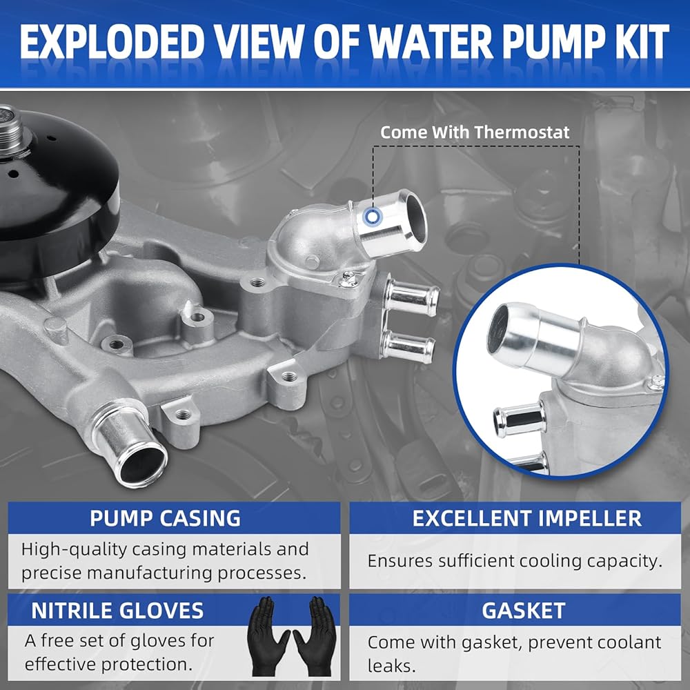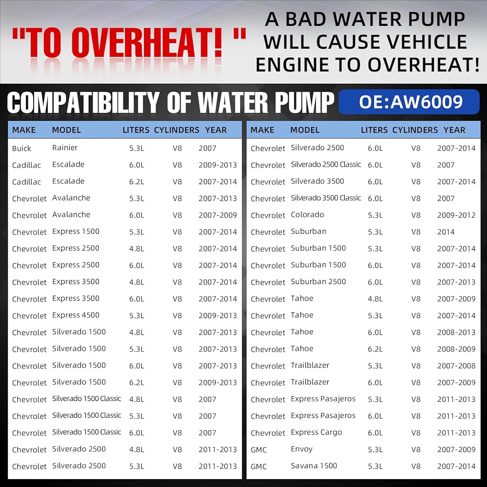 Professional AW6009 Water Pump Kit with Thermostat Gasket Fits For Chevy Silverado Tahoe Suburban Trailblazer Express, GMC Sierra Yukon, Buick, Cadillac, Hummer, Isuzu,4.8L/5.3L/6.0L/6.2L V8 Engine