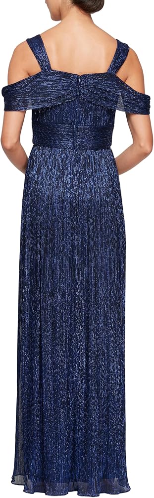 Radiant Metallic Charm: Illuminate the room in this floor length gown, boasting a stretch metallic knit for glamorous allure. This dress dazzles with sparkling detail, complemented by cold shoulder sleeve detail.