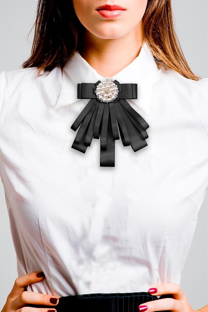 Womens Black Tie: Womens bow tie is made of soft polyester,with layers of ribbons that naturally hang down and pearls in the center; This exquisite bow tie shows more feminine elegance than the regular model