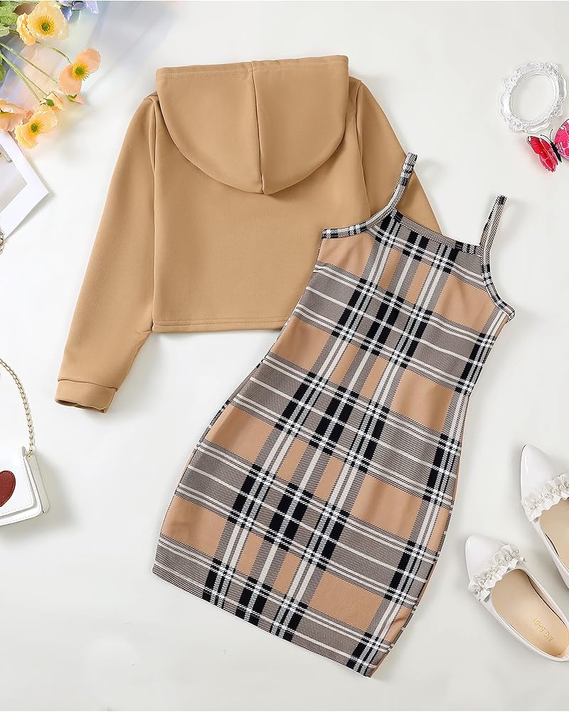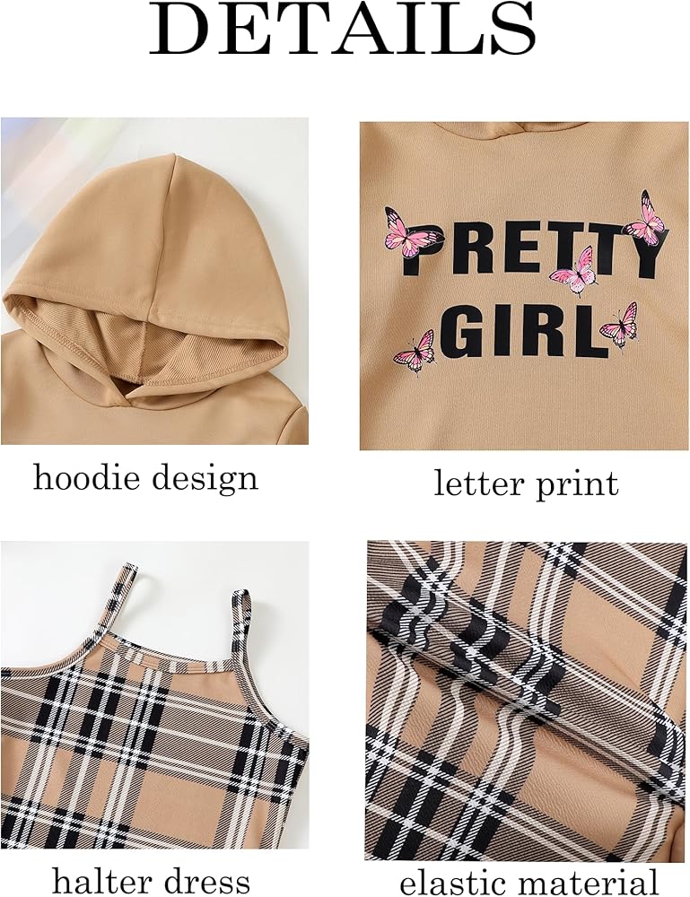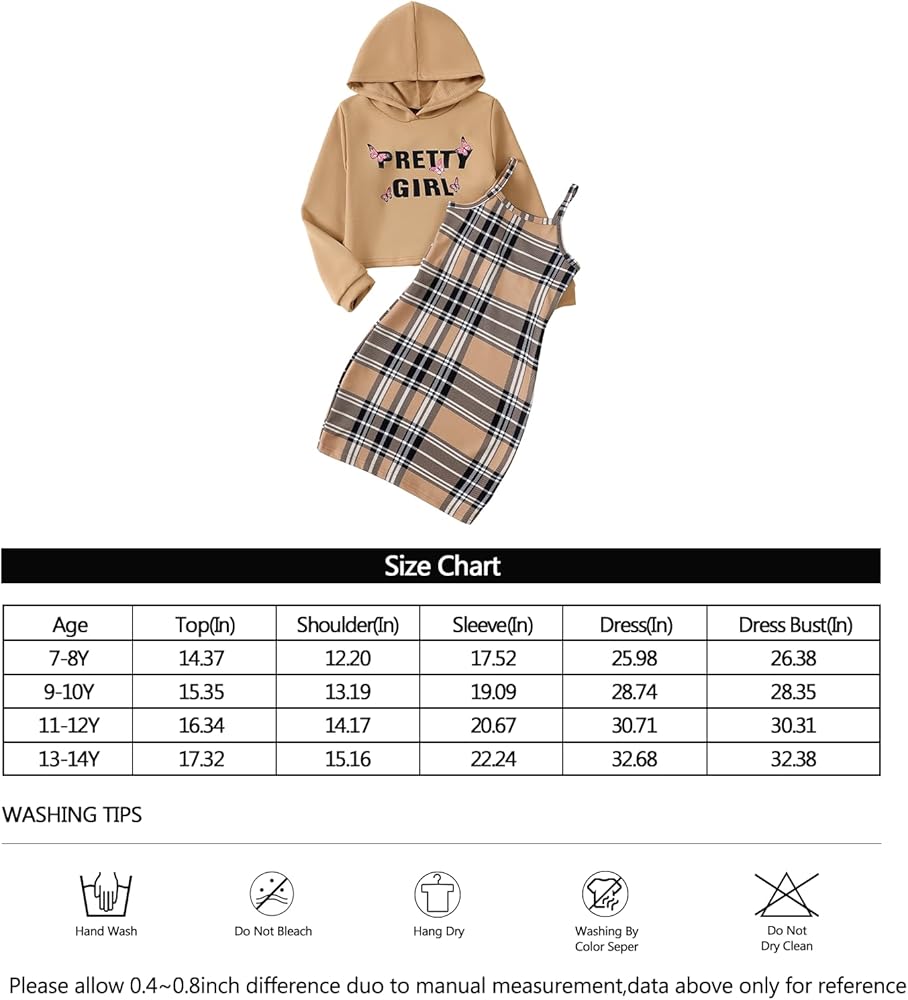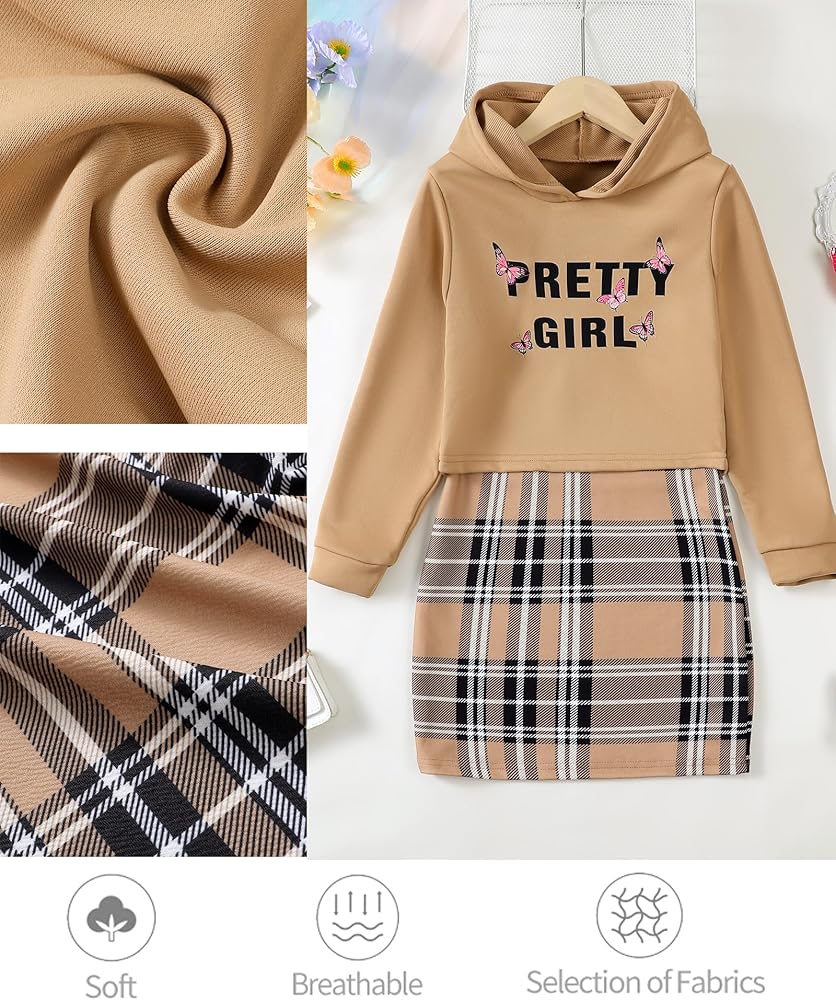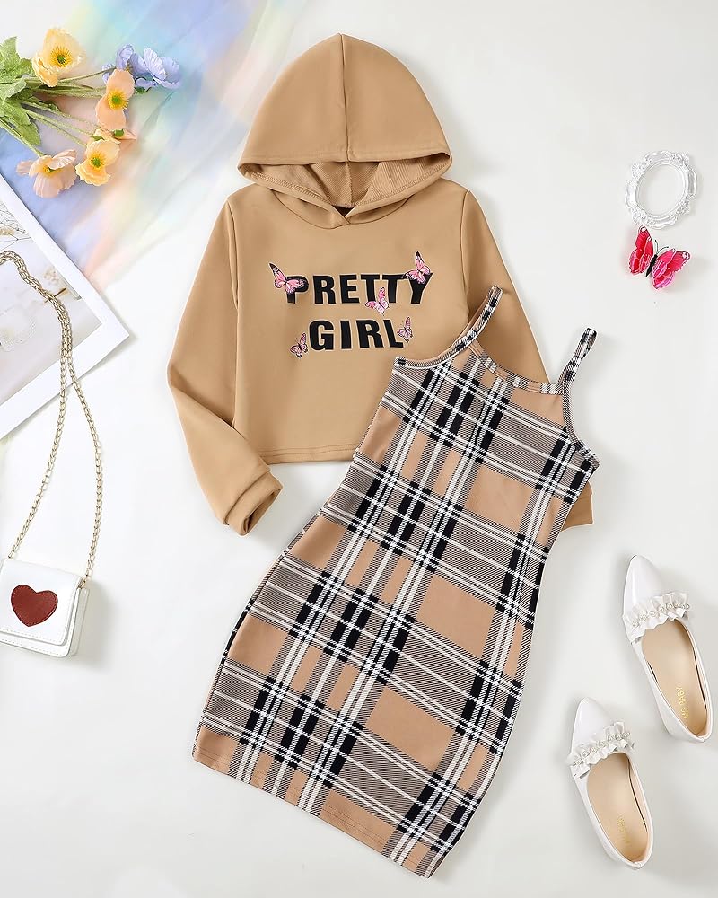 Feature:The girls fall outfits features cami lattice bodycon dress with long sleeve butterfly/print letter crop hoodie top that are both stylish and warming.Our girls'clothing sets is mid-length designs combining with different plaid color dresses and matching hoodie,that will be so casaul yet fashionable.