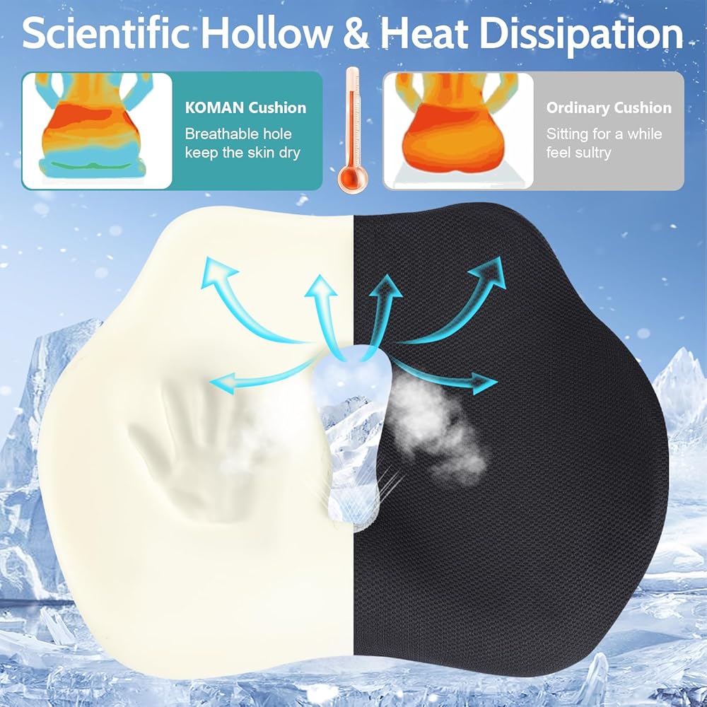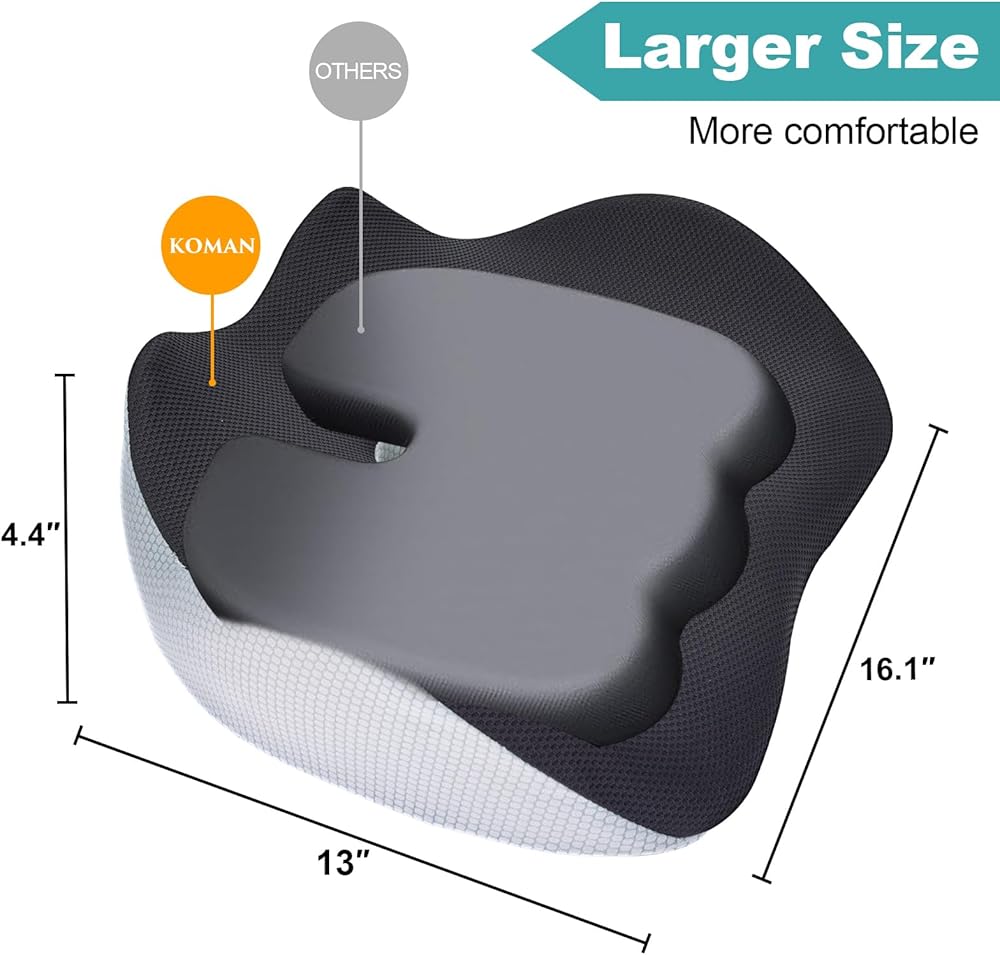 Supports Tailbone & Improves Posture: KOMAN pressure relief seat cushion features a three-in-one design, including front leg protectors, rear spine protectors, and elevated wings on both sides.The computer chair cushion offers excellent comfort and effective support for the tailbone and promotes healthy posture, relieving pressure on the hips caused by sedentary lifestyles.Ergonomic hollow design for superior comfort,helps with most sitting pain due to sciatica, herniated discs,coccyx pain, pregnancy, hip pain and hemorrhoids.