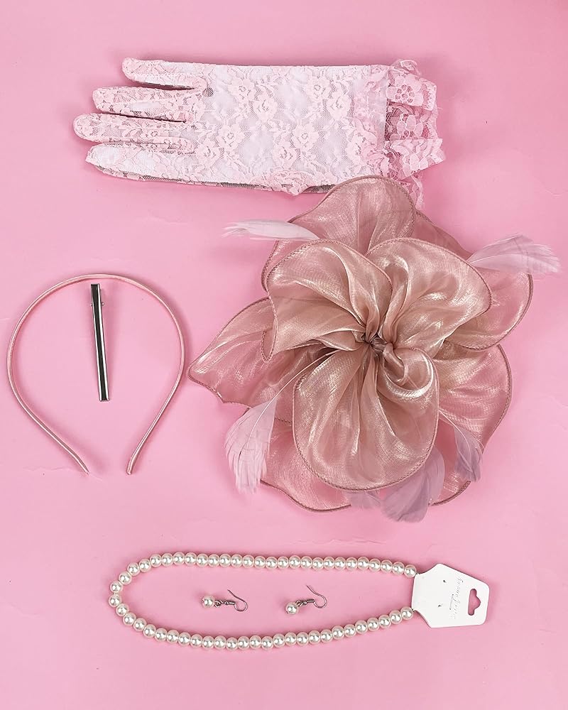 4 Pack Organza Fascinator Hat with Lace Gloves Set for Women Tea Party Cocktail Church Wedding Derby 1920s Elegant Mystery Headwear Halloween Cosplay Party: The tea party fascinator set includes 1 fascinator hat, 1 imitation pearl necklace, 1 pair of lace gloves and 1 pair of pearl pendant earrings.