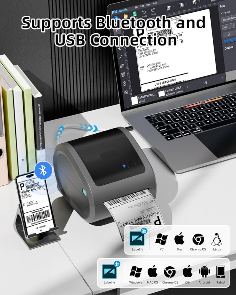 [ Supports Bluetooth and USB Connectivity ] We made it! Our bluetooth shipping label printer supports bluetooth on Phones, Mac, Win(bluetooth support iOS, Android, only support Win 7 or above system). Besides, Wireless thermal printer can also be connected to USB and compatible with Windows, Mac, ChromeOS systems. (Warm Tips : bluetooth need to connected via Labelife editing app )